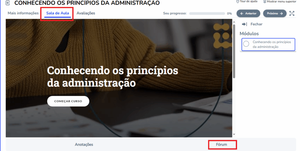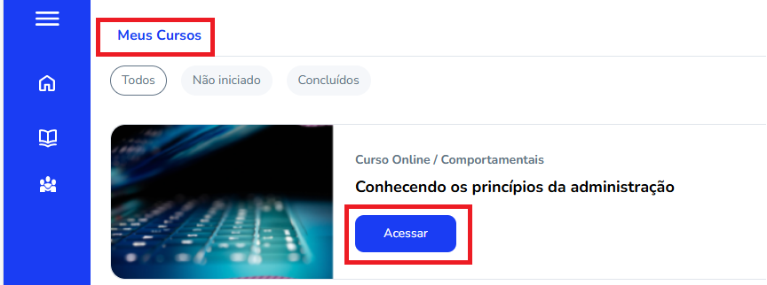 Após efetuar o login no ambiente virtual de aprendizagem, na aba Meus cursos, clique em Acessar.