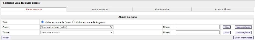 Selecione um curso, uma turma e clique em “Exibir Informações”. O sistema apresenta a seguinte tela: