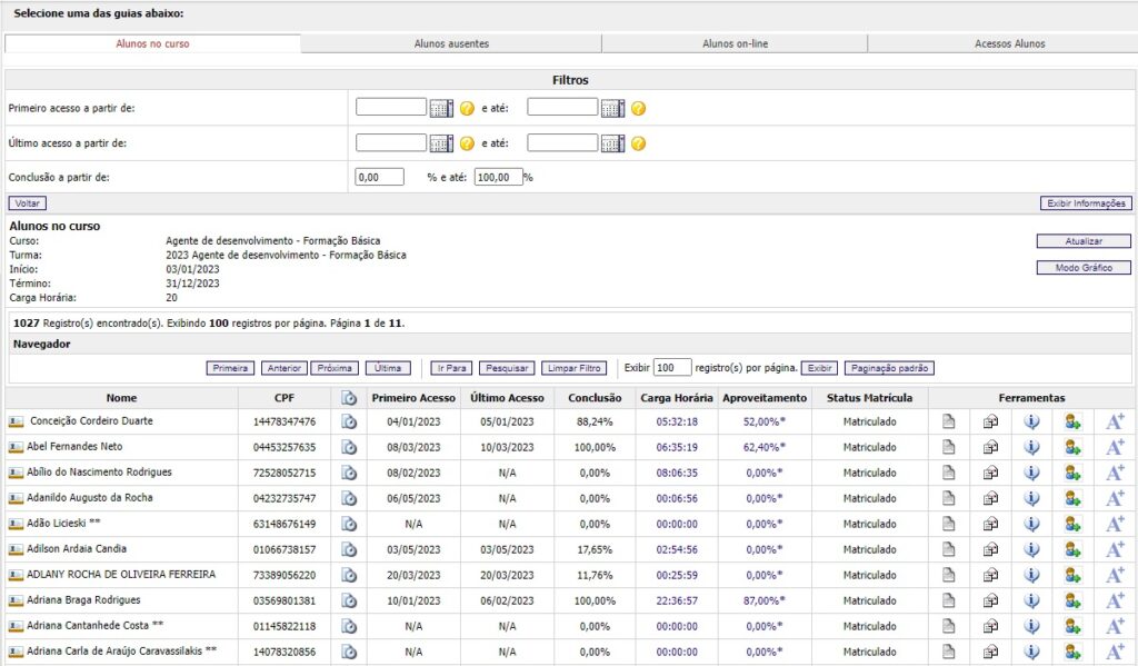 Serão exibidas as informações dos alunos da turma selecionada, como primeiro e o último acesso, o percentual de conclusão, o aproveitamento, o status e as ferramentas: meu histórico, mensagens, expectativa do curso, tutor eletrônico e o bloco de anotações.