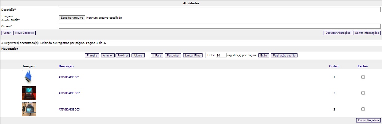 - No campo “Ordem”, determine a ordem de exibição da nova atividade na listagem de itens cadastrados.