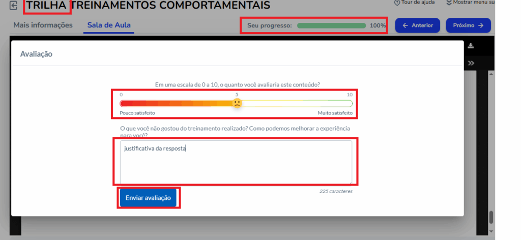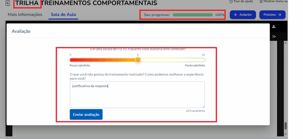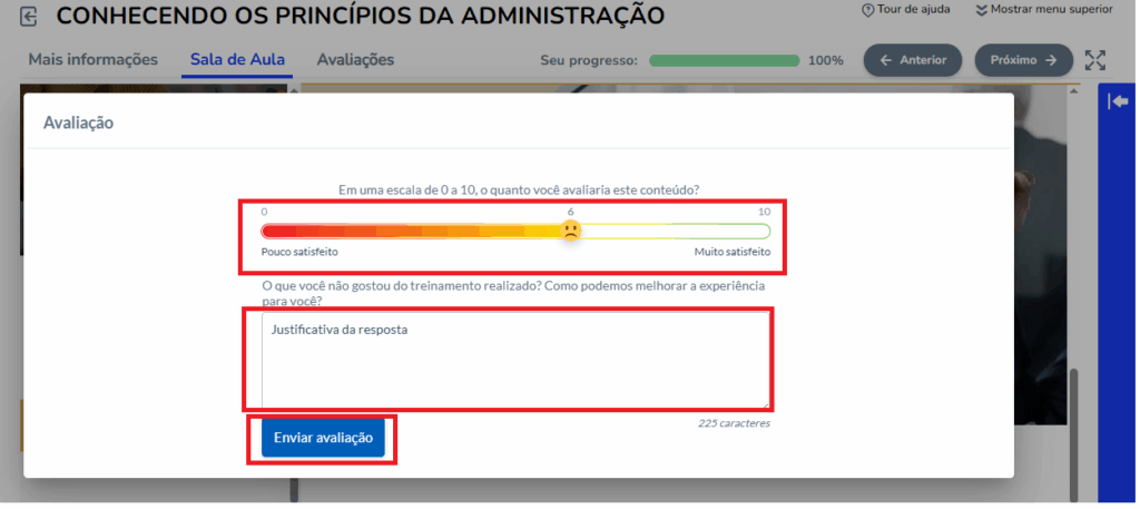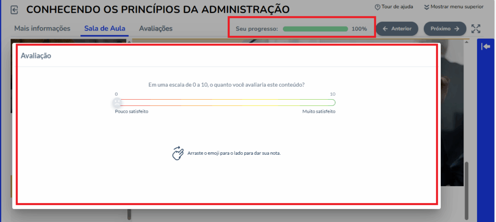 Para acessar a avaliação, o aluno deverá concluir o curso, após a conclusão a avaliação NPS é exibida para o preenchimento.