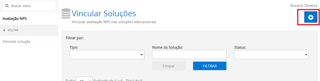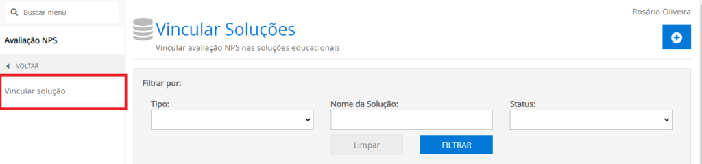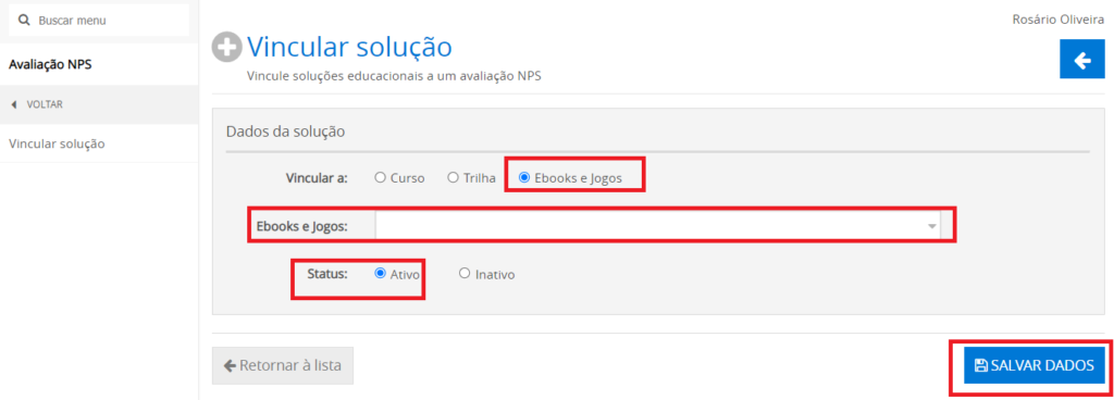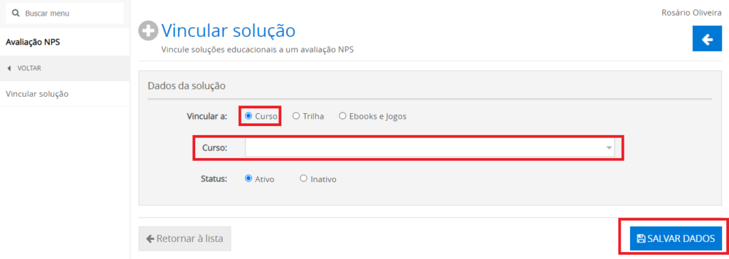 Para associar a avalição NPS nos cursos, trilhas ou mídias é necessário fazer a atribuição da avaliação. Vá ao menu Conteúdo >> Avalição NPS >> Vincular Solução.