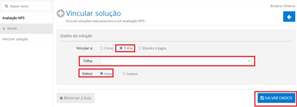 Clique no tipo de associação, trilha, turma de trilha, status e clique em Salvar Dados.