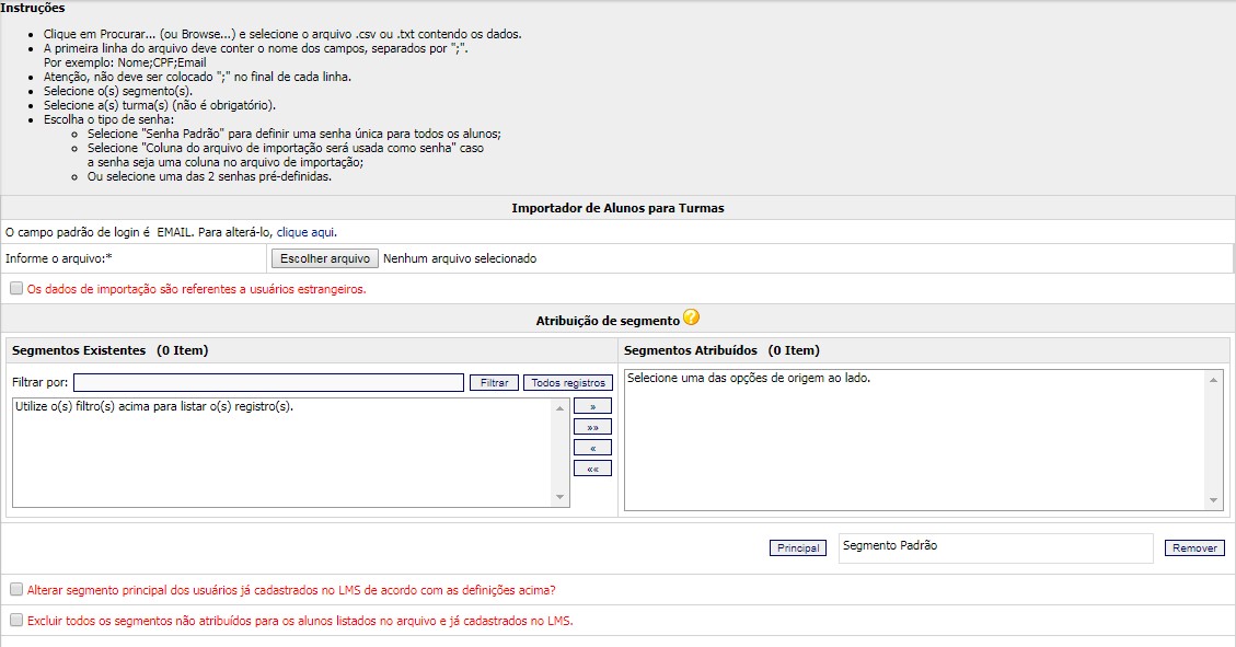- Caso habilite o parâmetro “Excluir todos os segmentos não atribuídos para os alunos listados no arquivo e já cadastrados no LMS”, os alunos que já se encontram cadastrados na plataforma e que estão no arquivo de importação terão seus segmentos excluídos, mantendo apenas os segmentos atribuídos durante a importação.