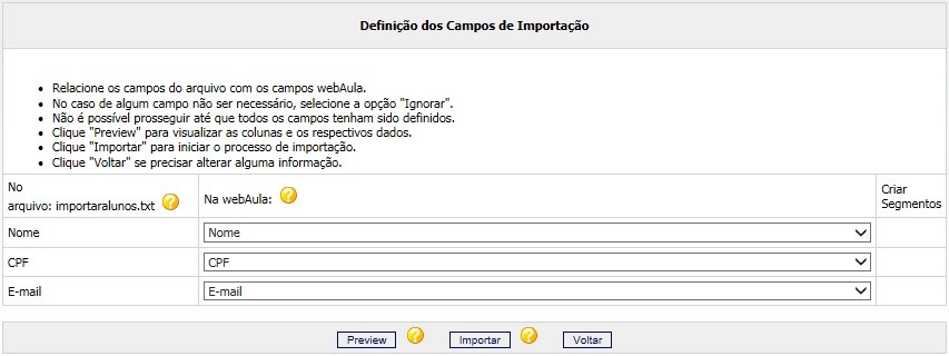 - Relacione os campos do arquivo com os campos existentes na plataforma, caso a relação não tenha sido feita automaticamente. Para isso, utilize as combos de seleção.