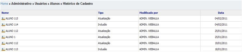 Uma lista como a do exemplo abaixo será exibida, contendo o nome do aluno cujo cadastro foi modificado, o tipo de alteração realizada (se inclusão ou atualização), o nome do usuário responsável pela modificação e a data em que esta ocorreu: