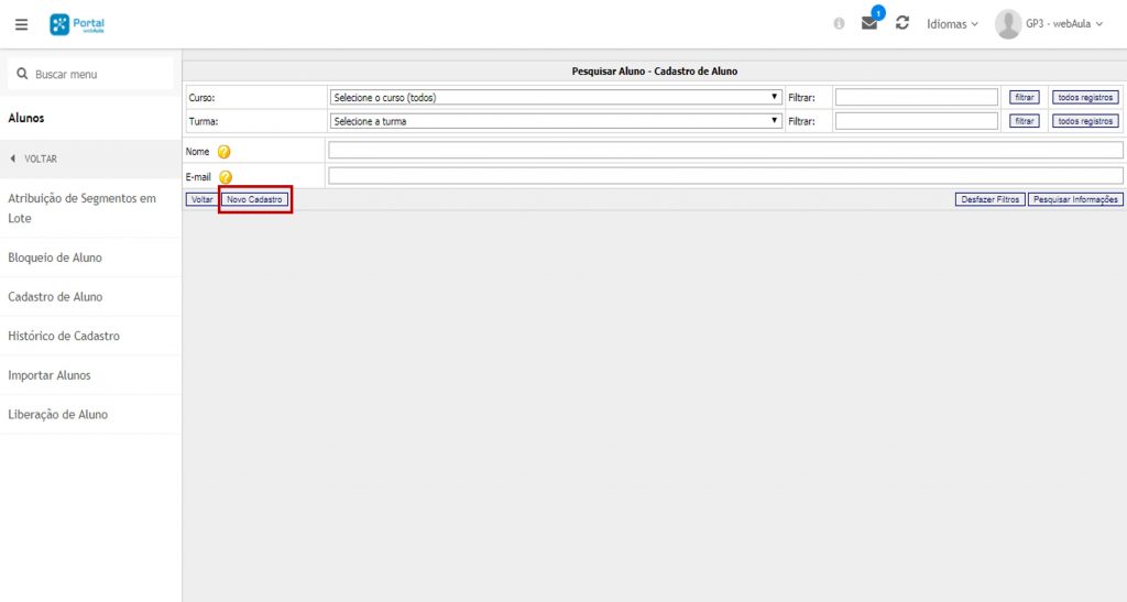 1. Na área “Pesquisar Aluno – Cadastro de Aluno”, acione o botão Novo Cadastro ao final da página.