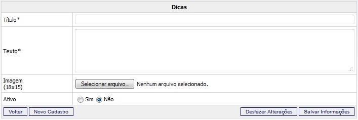 - No campo “Ativo”, marque “Sim” para que a nova dica seja exibida no Ambiente Aluno; ou marque “Não”, para não exibi-la.