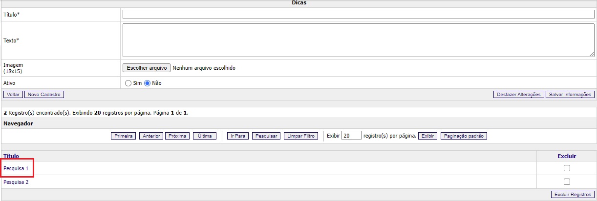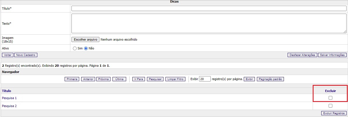 - Na listagem de dicas cadastradas, marque a caixa de seleção correspondente à dica a ser excluída, na coluna “Excluir”.