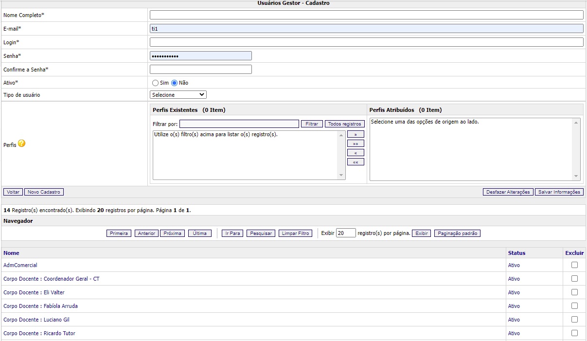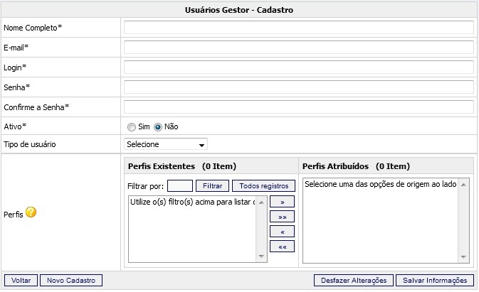 Em Administrativo » Usuários » Usuários do Gestor » Cadastro: