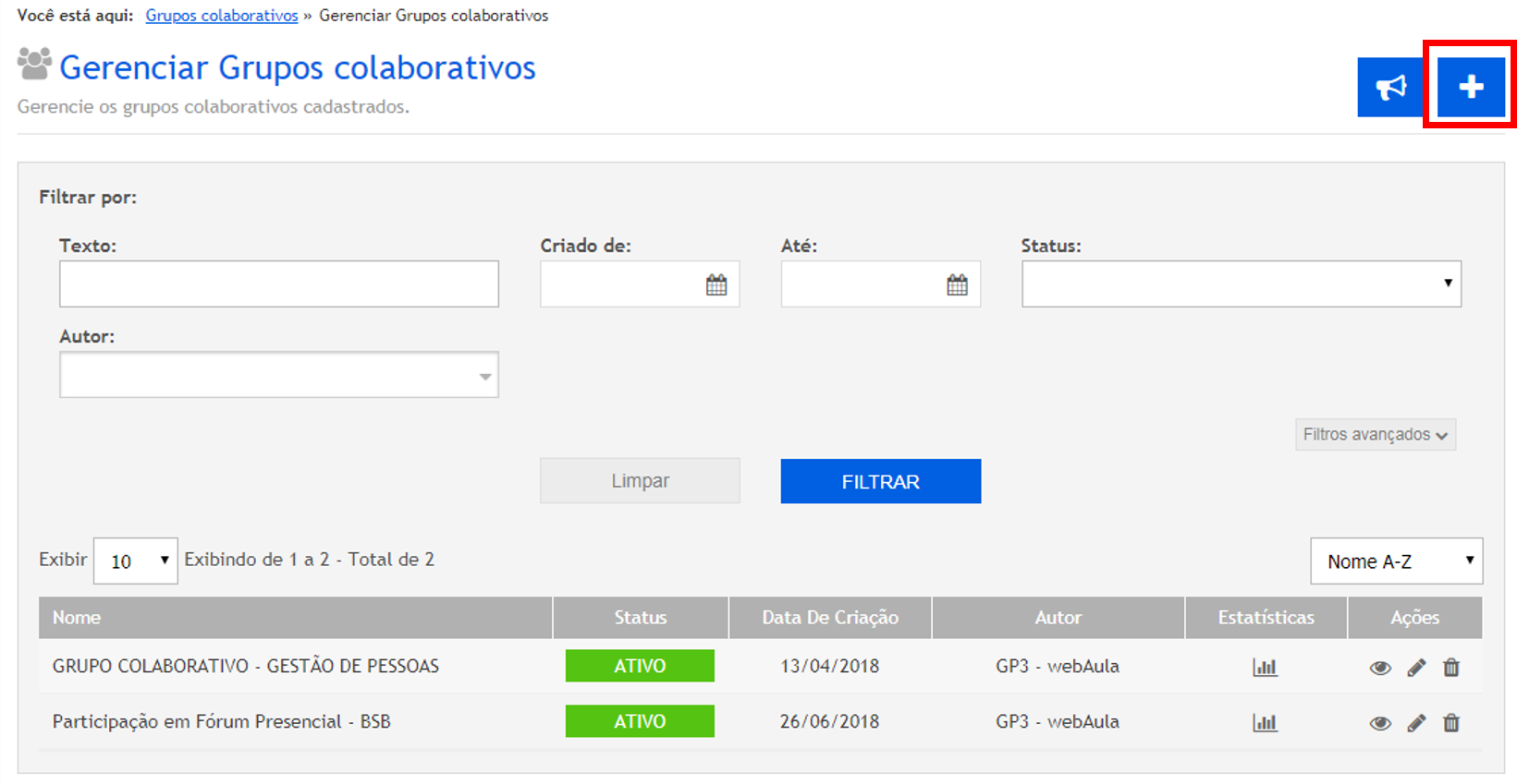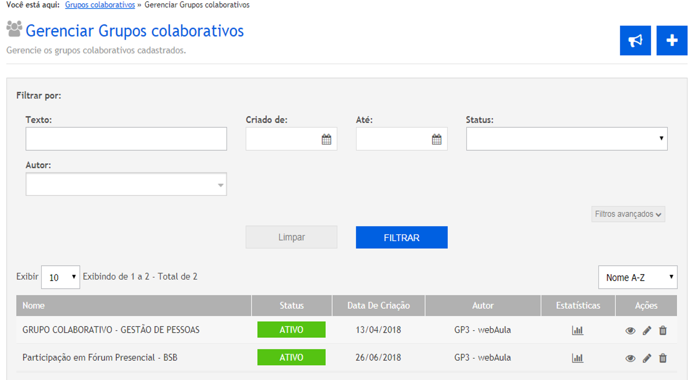 Caso já existam grupos colaborativos, eles serão listados conforme mostra a imagem acima. Na listagem podemos observar o nome do grupo, status, data de criação, quem criou o grupo e os dados estatísticos. Na coluna ações poderemos realizar ações que veremos no decorrer deste artigo.