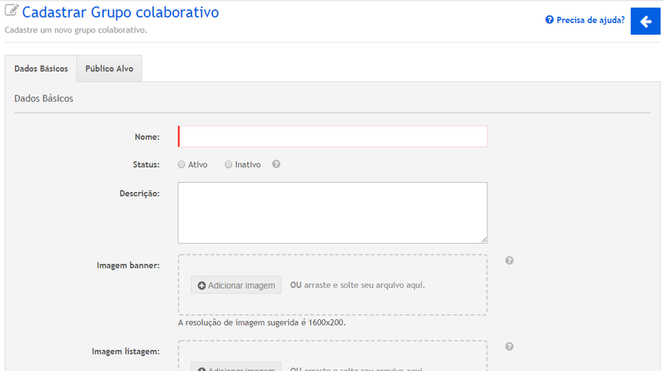 Clicando no ícone, será habilitado o formulário de cadastro de Grupos Colaborativos, conforme podemos ver na imagem abaixo: