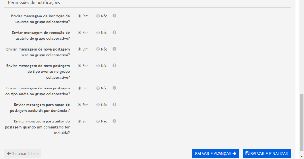 Agora vamos definir as permissões relacionadas a postagens e envio de mensagens no grupo colaborativo.