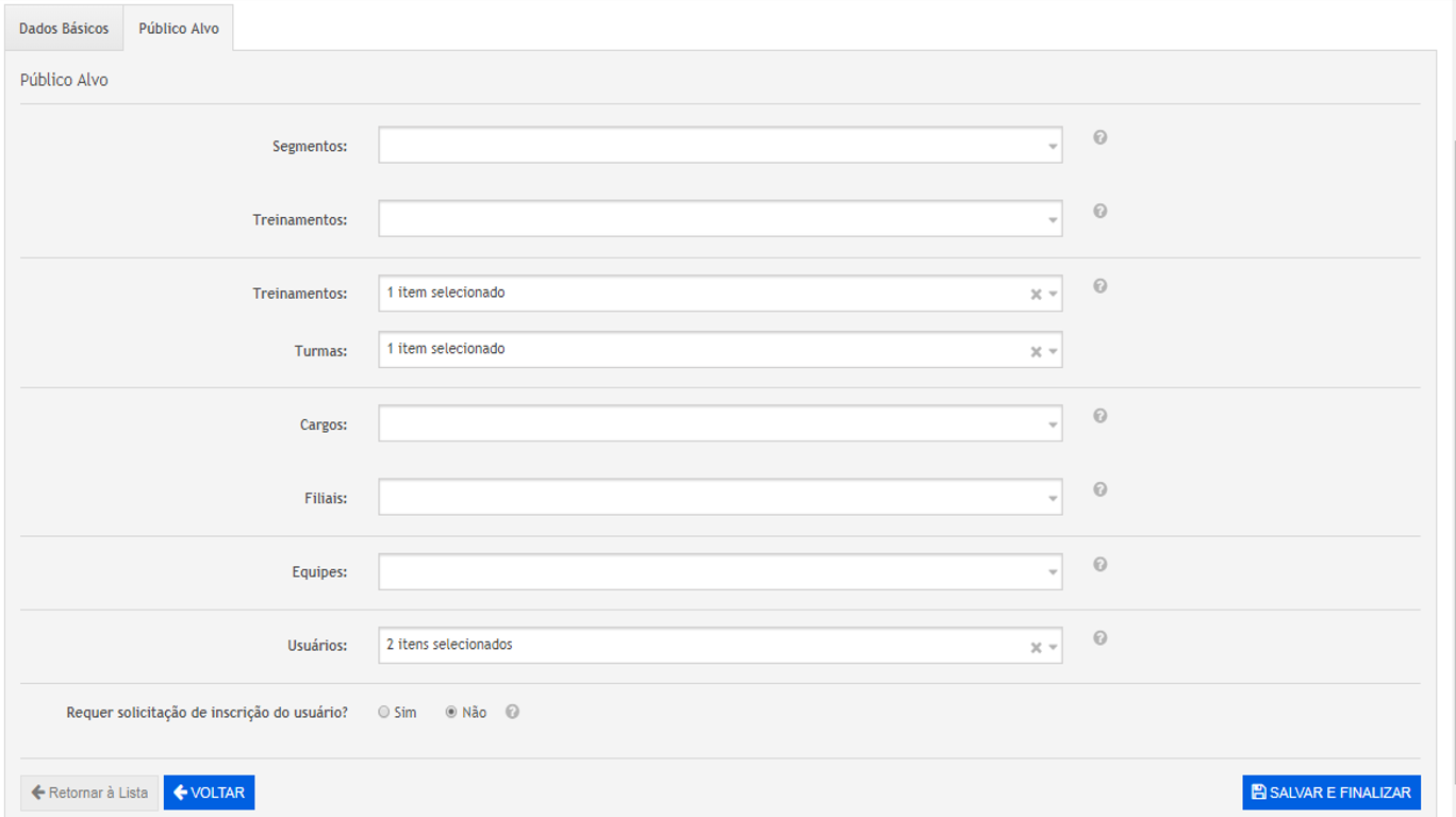 Após realizar as definições deste formulário de cadastro, clique no botão “Salvar e Avançar” para definir o público alvo que terá acesso ou fará parte do grupo.