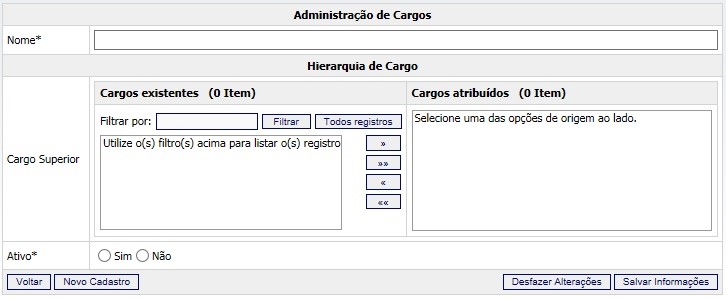 - No campo “Ativo”, marque “Sim” para deixar o novo cargo disponível; ou marque “Não”, para deixá-lo inativo.