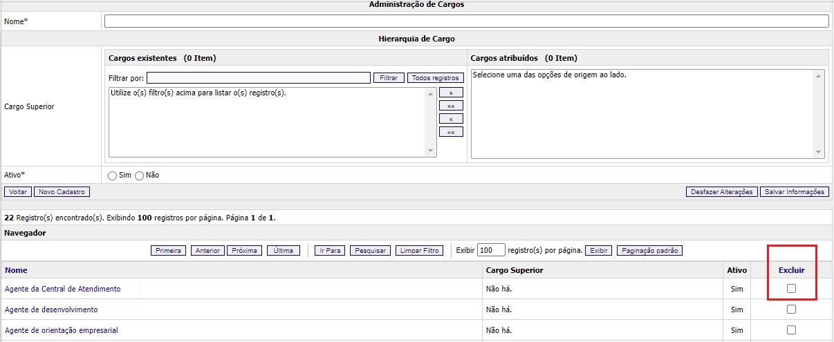 Na listagem de cargos cadastrados, marque a caixa de seleção correspondente ao cargo a ser excluído, na coluna “Excluir”.