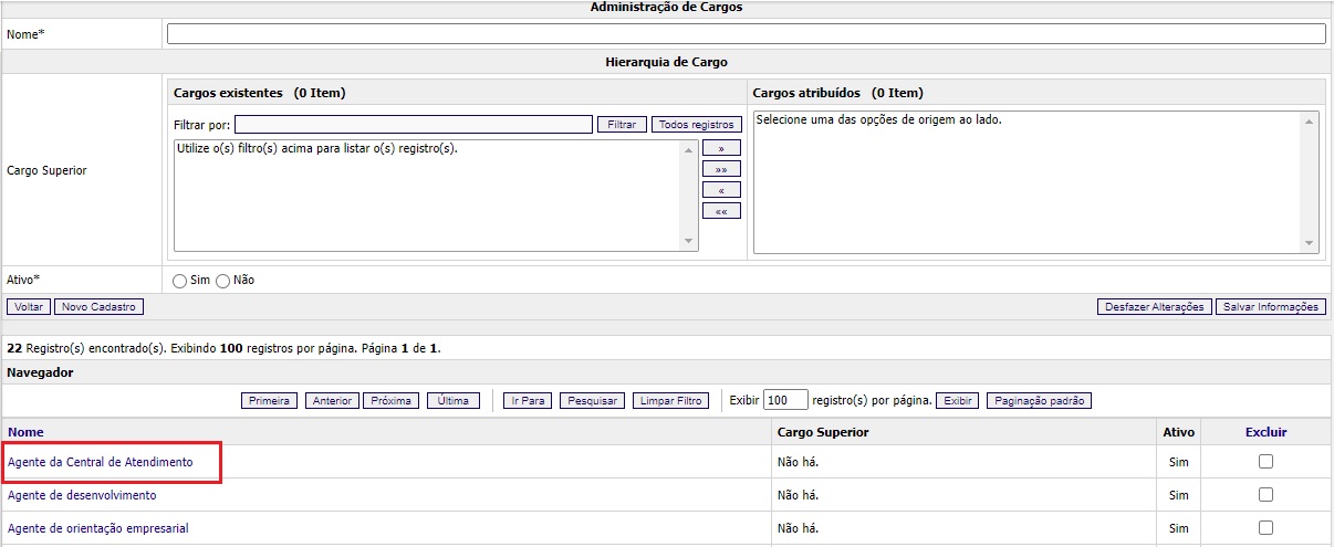 Acessando o caminho Administrativo » Cargos, o sistema habilitará ao final da tela todos os cargos cadastrados: