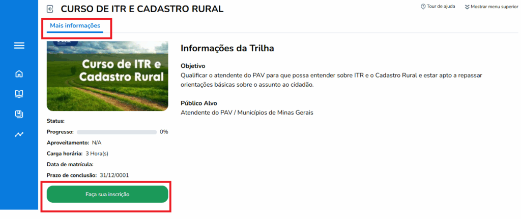 Clique no curso desejado, em seguida na aba Mais informações, clique em Faça sua inscrição.