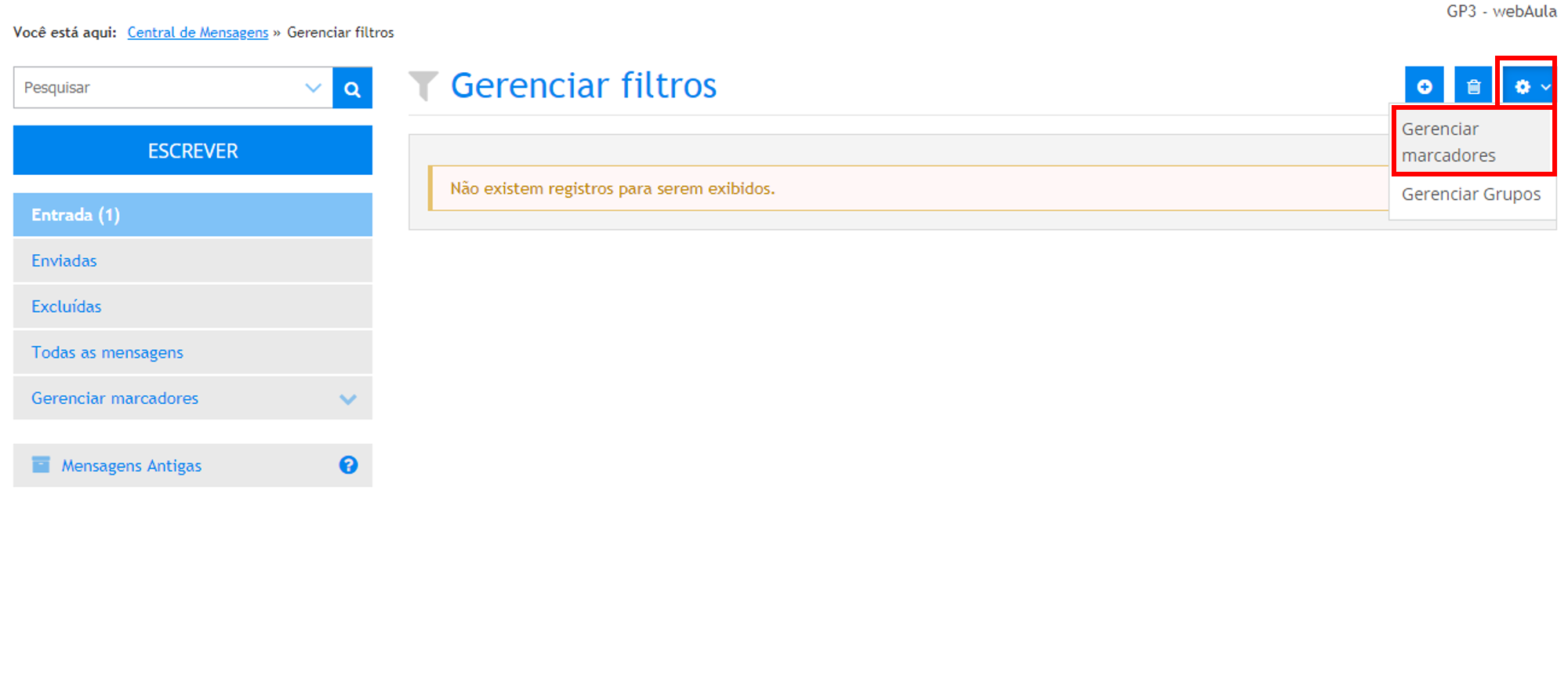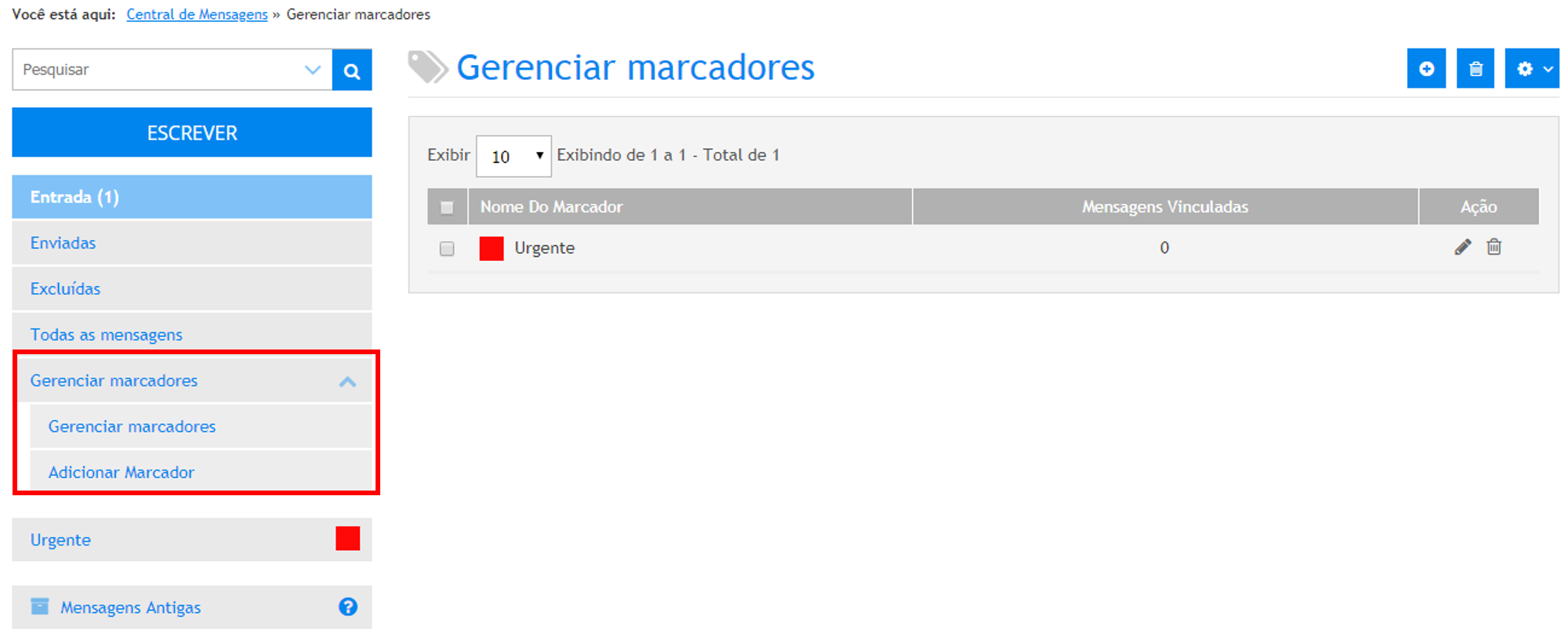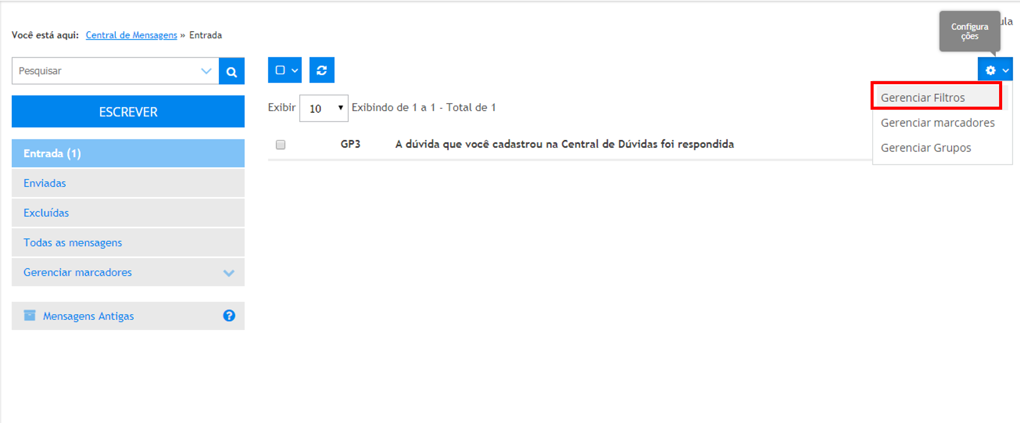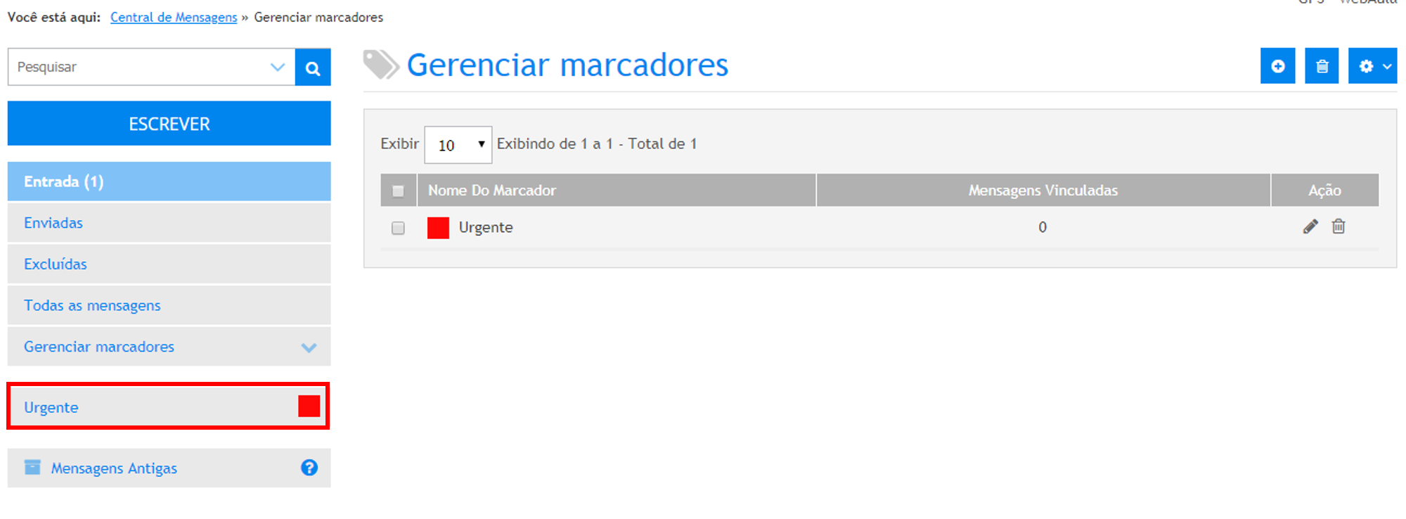 Para tanto, acesse o menu Administrativo » Central de Mensagens » Acessar Central de Mensagens e acione o botão Mensagens Antigas.