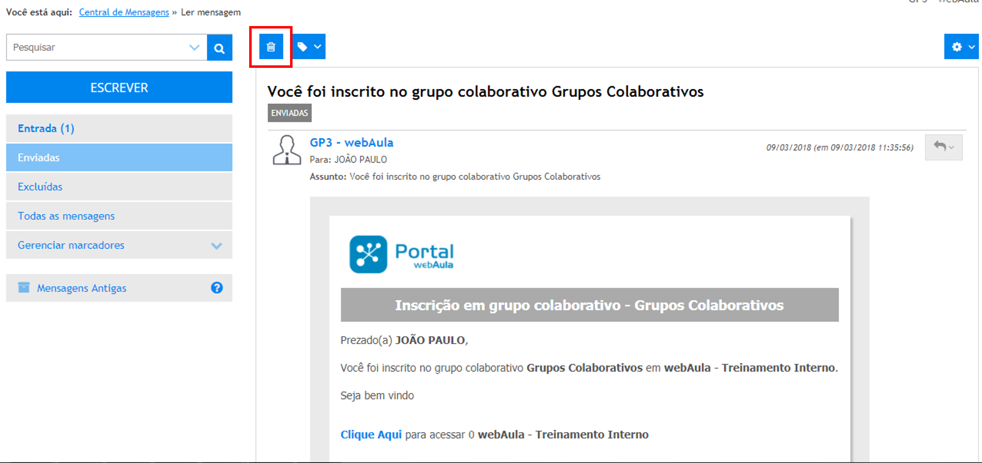 Para excluir uma mensagem, abra a mensagem e acione o botão Excluir: