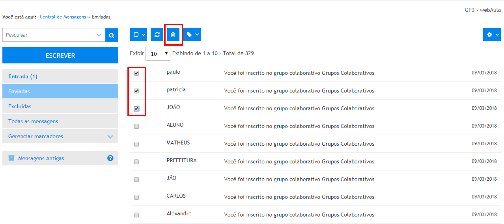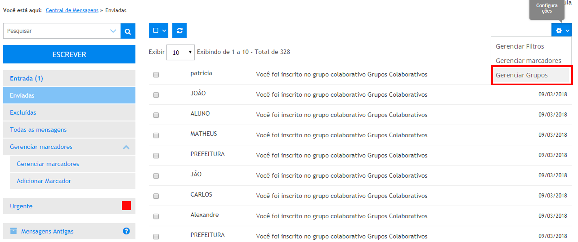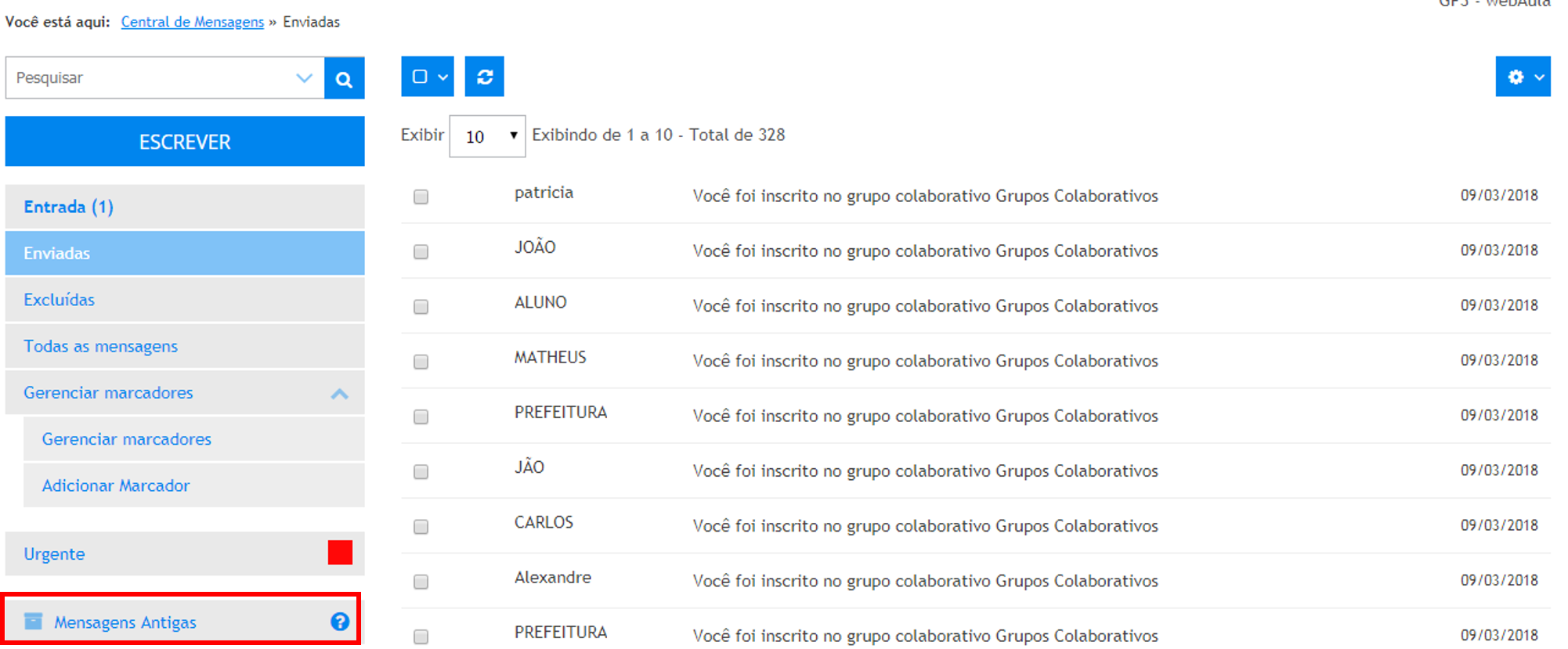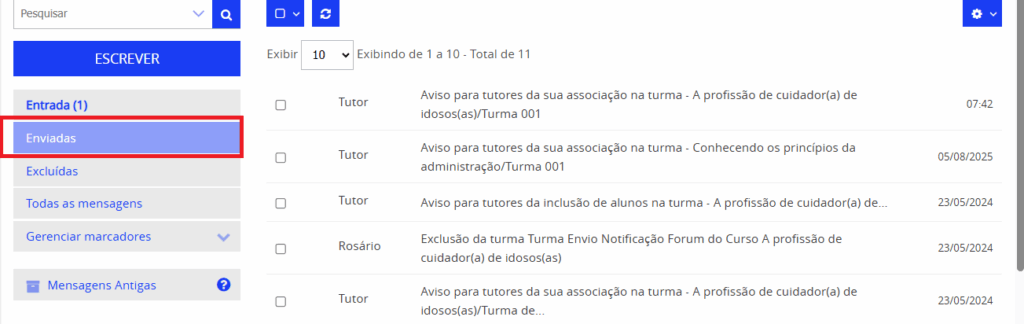 4 . Para acessar as mensagens enviadas, clique em Enviadas.