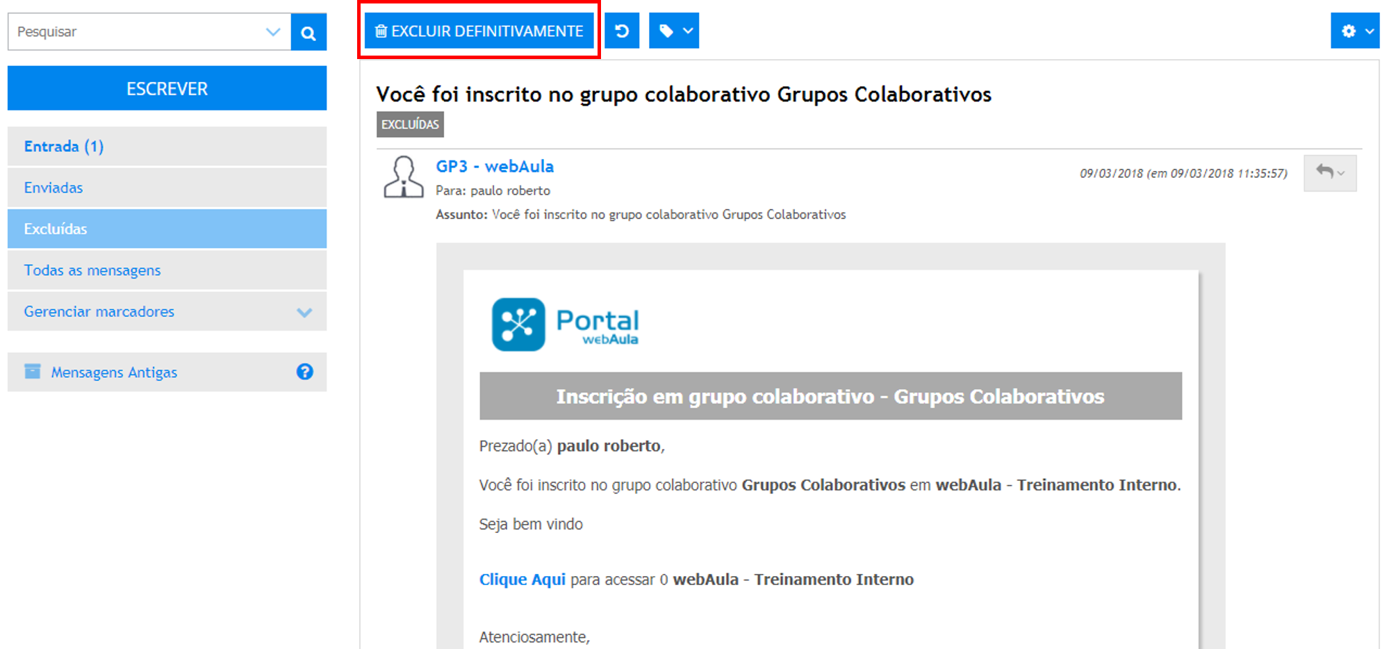 Para excluir uma mensagem da central de mensagens, abra a mesma na pasta de mensagens excluídas e acione o botão Excluir definitivamente: