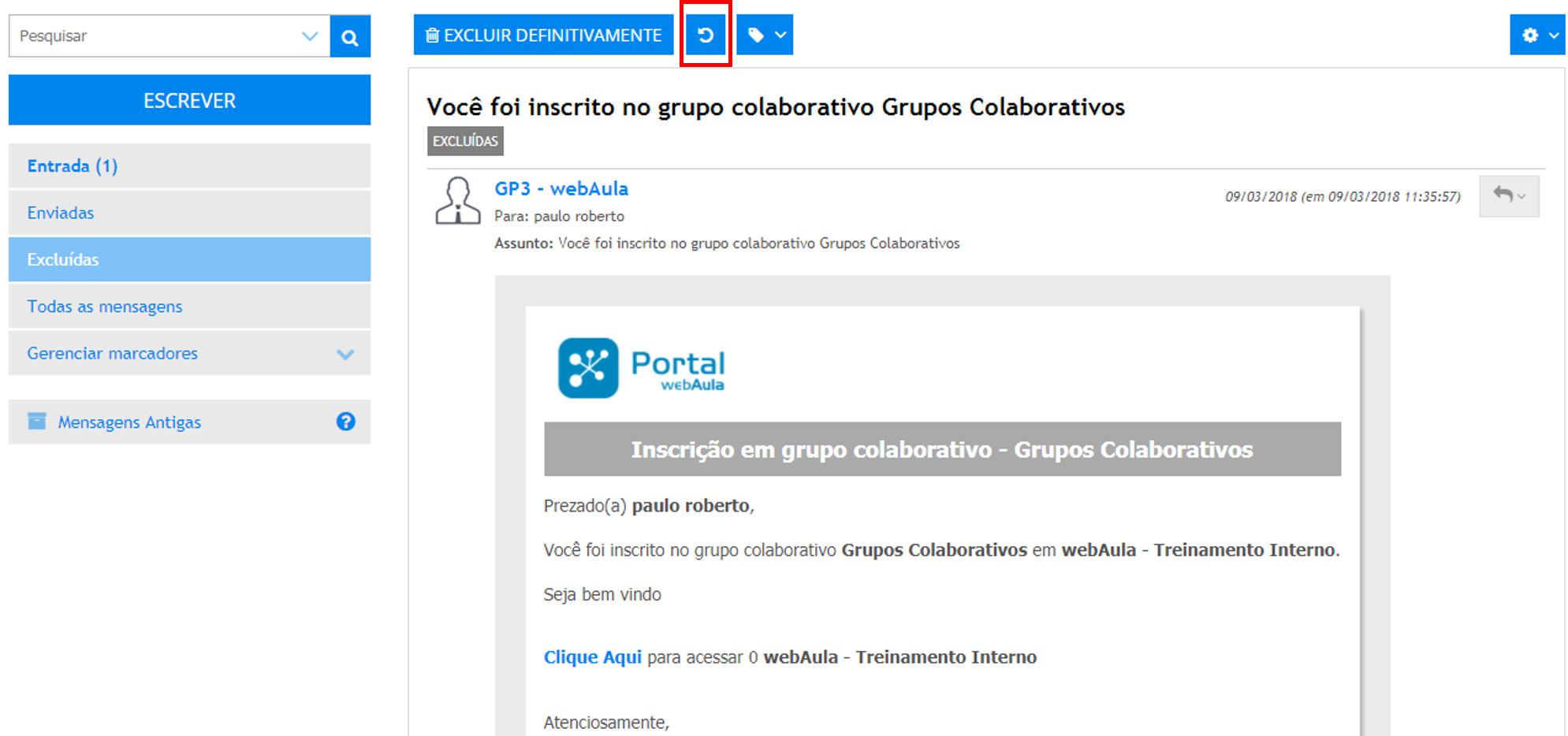 Para desfazer a exclusão de uma mensagem, abra a mesma na pasta de mensagens excluídas e acione o botão Restaurar: