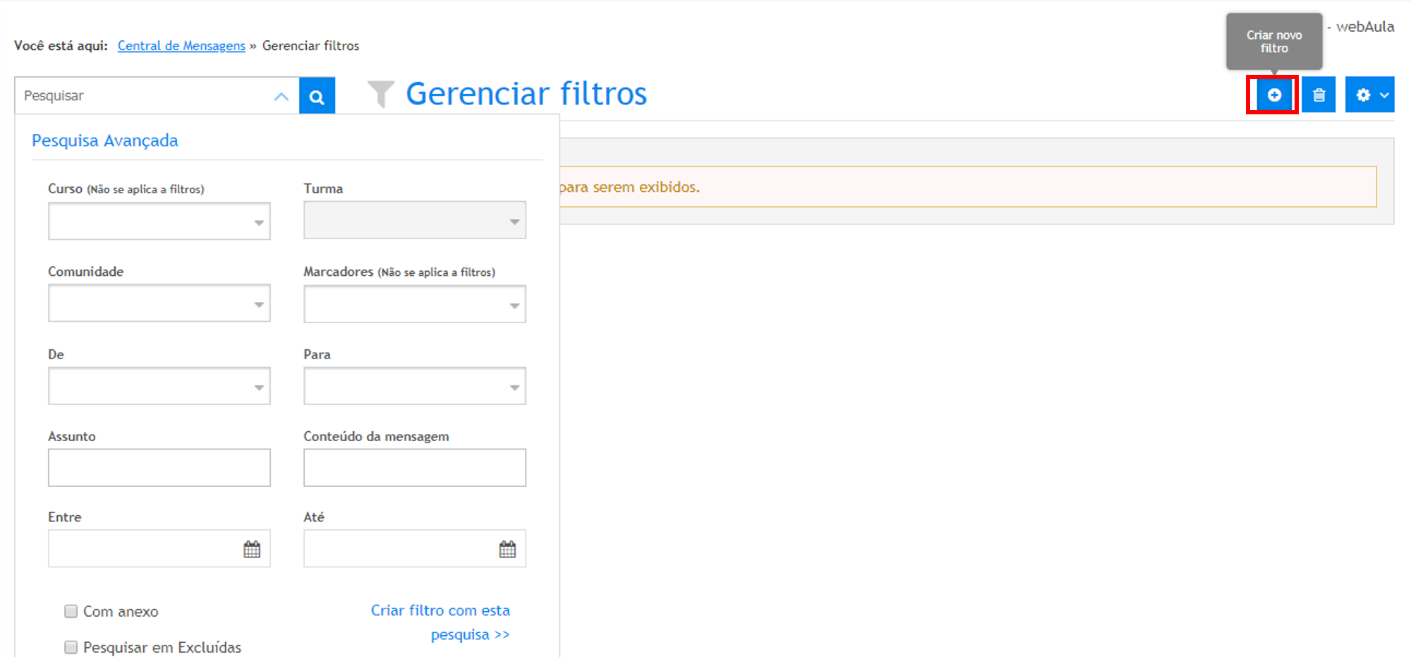 - Acionar o botão Criar novo filtro, preencha os campos desejados e acione o link “Criar filtro com essa pesquisa” ao final do formulário.