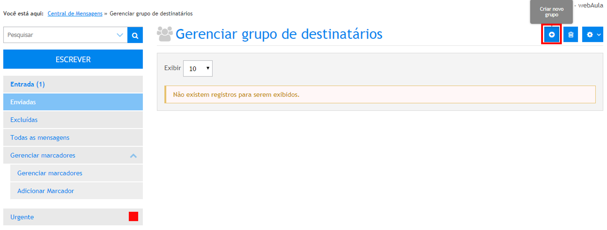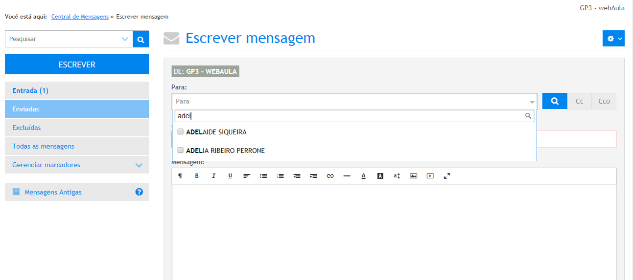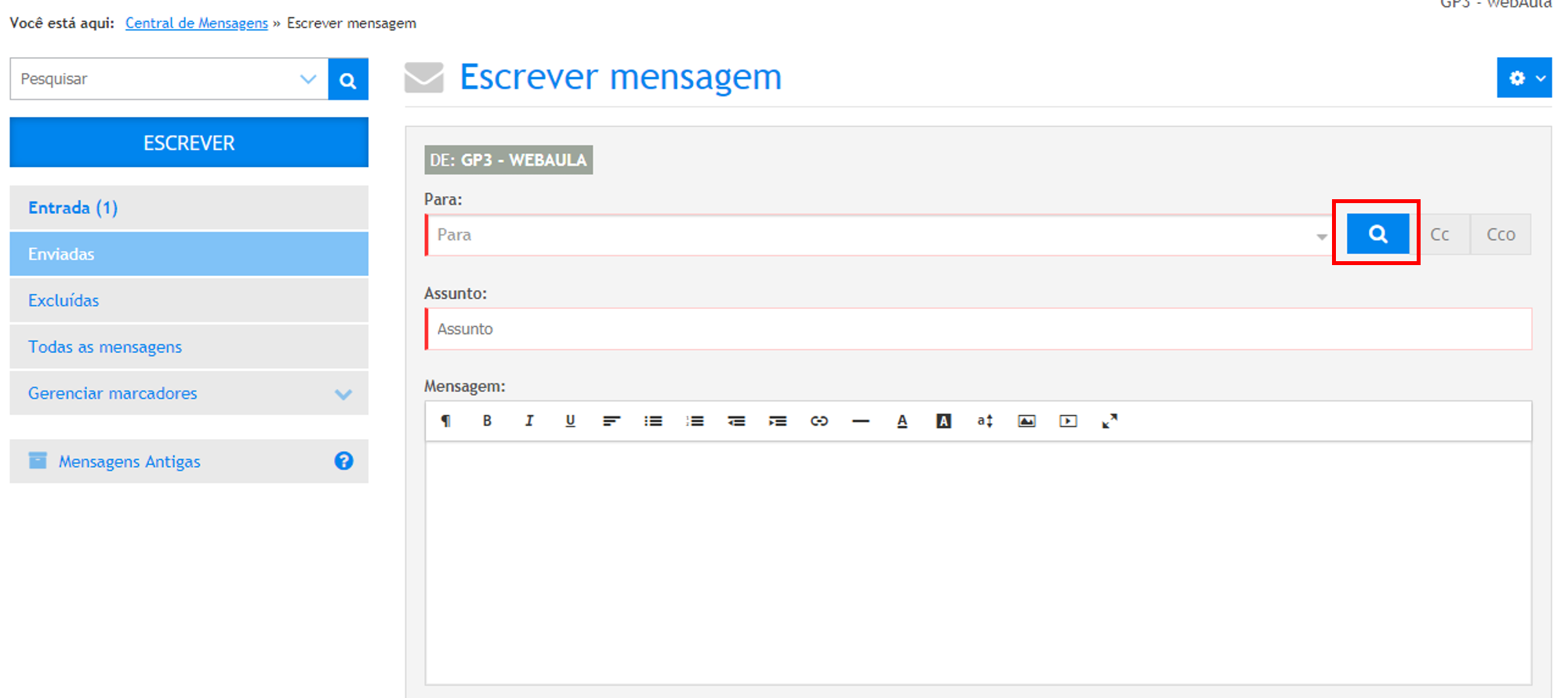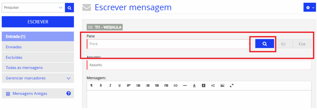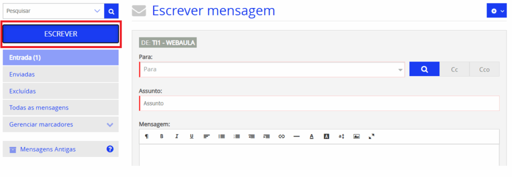 1 . Clique no botão Escrever, será exibida a área envio de uma nova mensagem.
