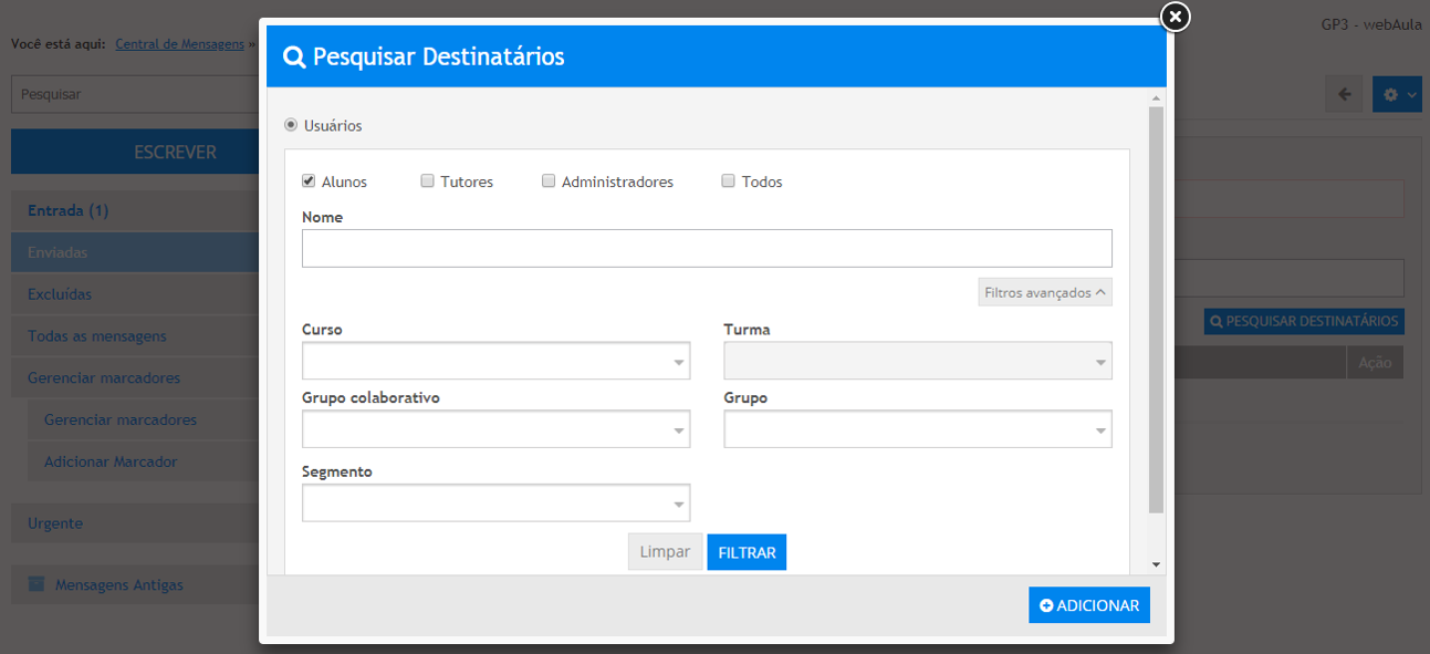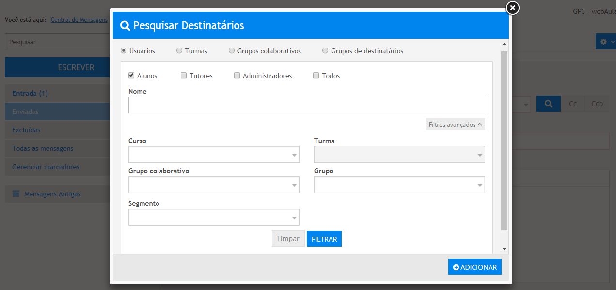 Selecione um ou mais perfis disponíveis para filtrar os destinatários da mensagem: "Alunos", "Tutores", "Administradores" e/ou "Todos ". Se necessário, realize uma busca específica digitando o nome do usuário para o qual deseja enviar a mensagem no campo "Nome", em seguida acione o botão Filtrar e marque a(s) caixa(s) de seleção correspondente(s) ao(s) usuário(s) a ser(em) incluído(s) como destinatário(s) da mensagem. Em seguida acione o botão Adicionar.