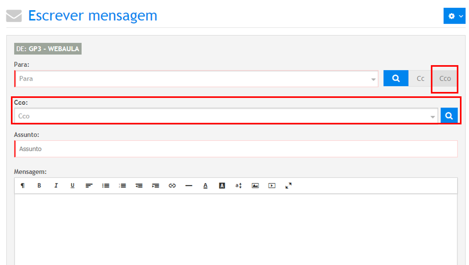 Clique no botão “Cco” e realize a busca no campo de “Cco”, seguindo as mesmas opções de busca já informadas na etapa “Filtrar Destinatários”.