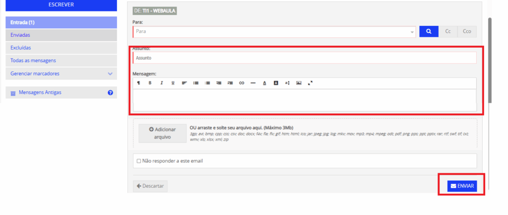 3 . Preencha os campos Assunto, Mensagem e clique em Enviar.