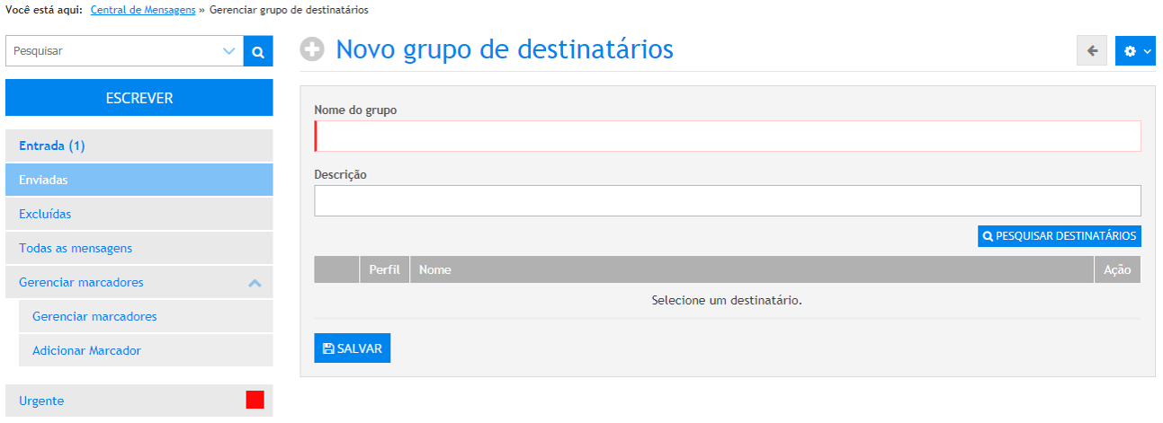 Observação: a lista de destinatários será construída de acordo com as permissões configuradas na tela Administrativo » Configurações » Central de Mensagens.
