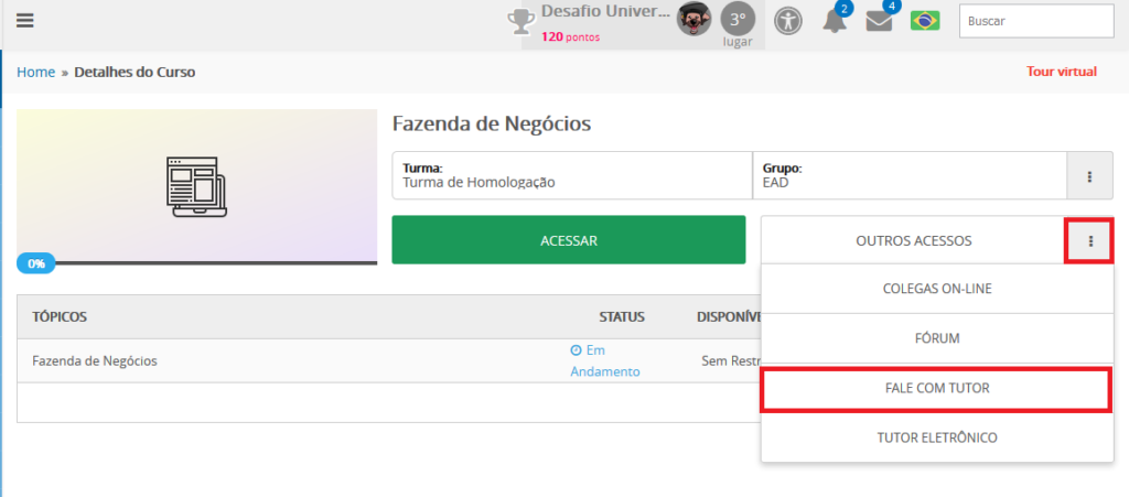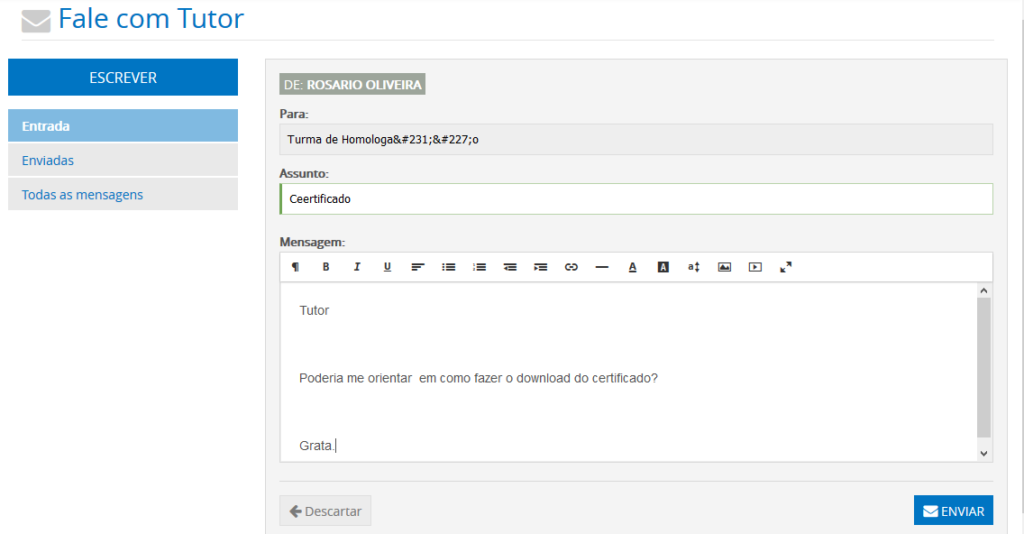Clique em Fale com o tutor, para fazer uma pergunta ao seu tutor. Preencha os campos e clique em Enviar.