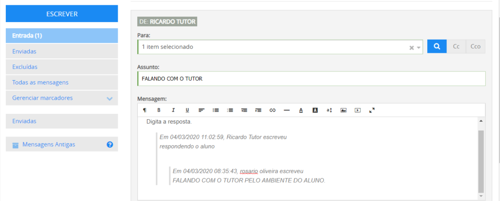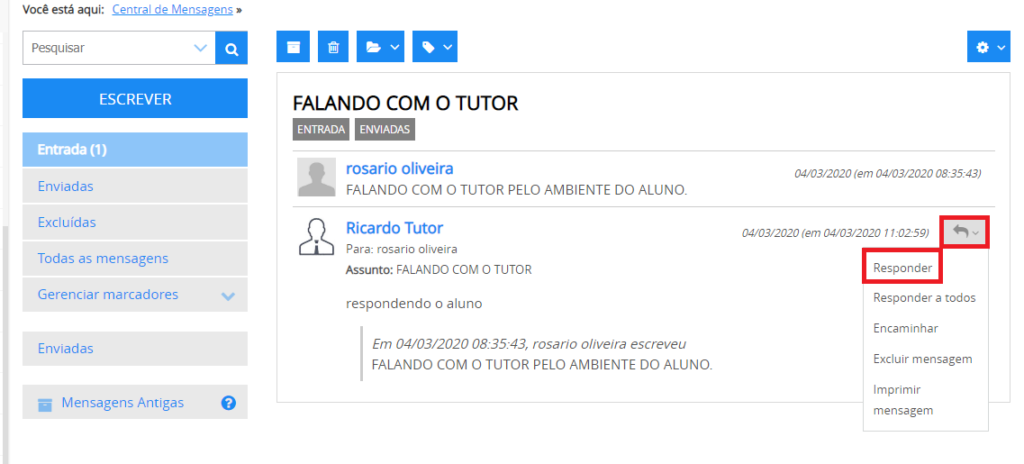 Serão exibidas as perguntas feitas pelos aluno no Fale com o tutor, para responder, clique no item em destaque.