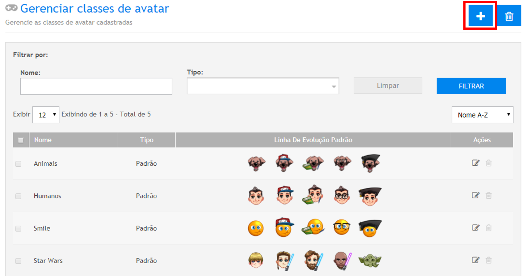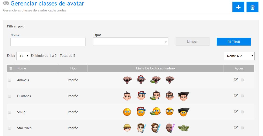 Acessando o caminho Social>Gamification>Avatares, o sistema habilitará a tela abaixo: