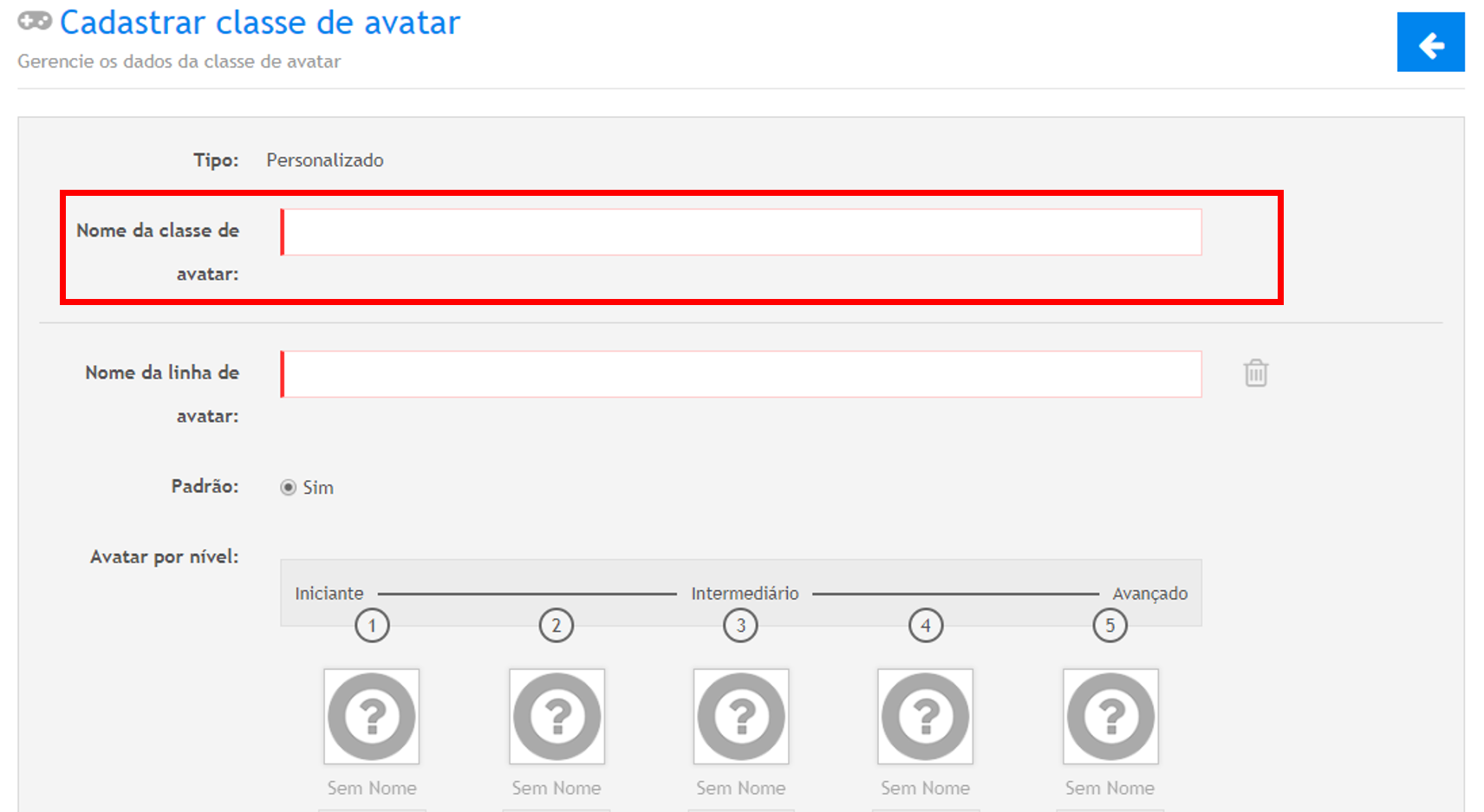 Avatar por nível: Insira aqui a imagem do avatar da linha a ser cadastrada, inserindo a imagem evolutiva do mesmo.