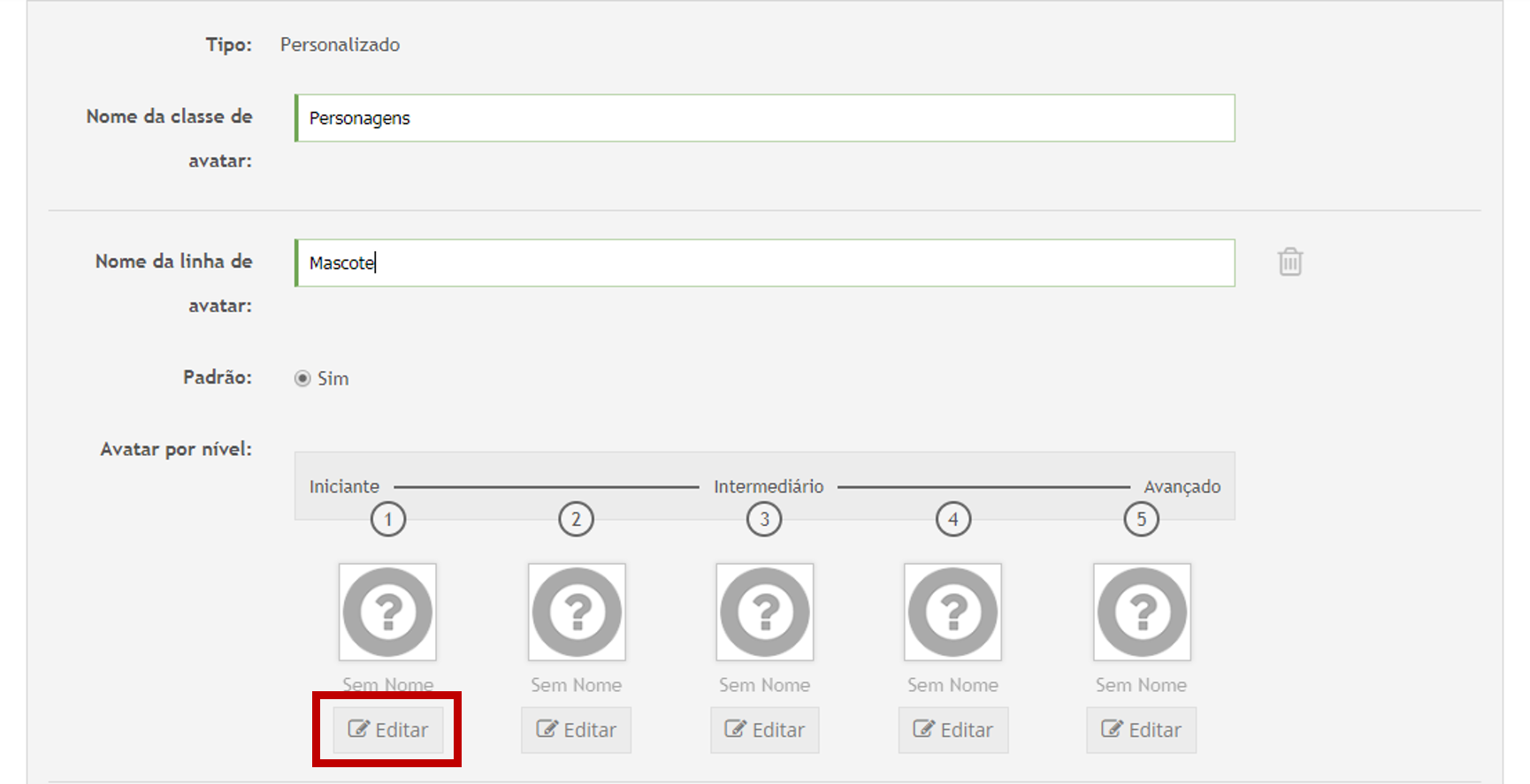 Padrão: Define se esta linha de avatar será a padrão caso a classe seja utilizada em um game;