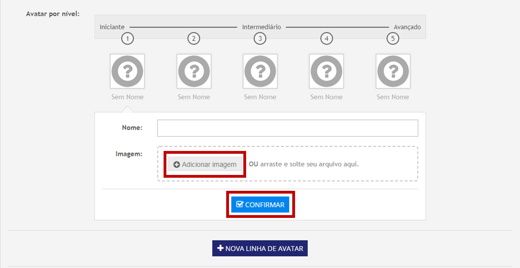 Insira o nome de descrição do primeiro nível de evolução do Avatar (exemplo: Iniciante), e clique em “Adicionar Imagem” e em seguida clique em “Confirmar”. Faça isso a seguir com todas as outras 4 caixas de evolução.