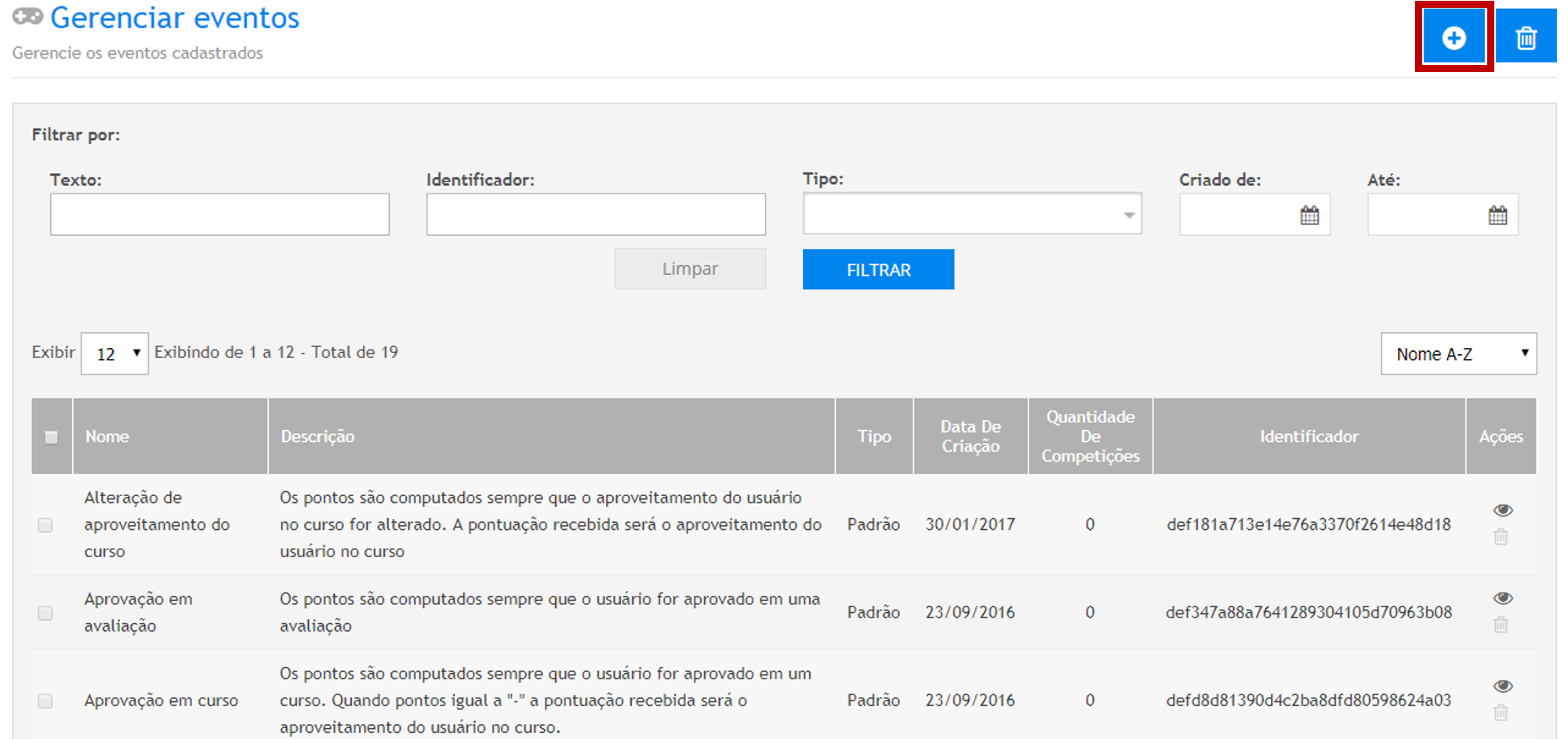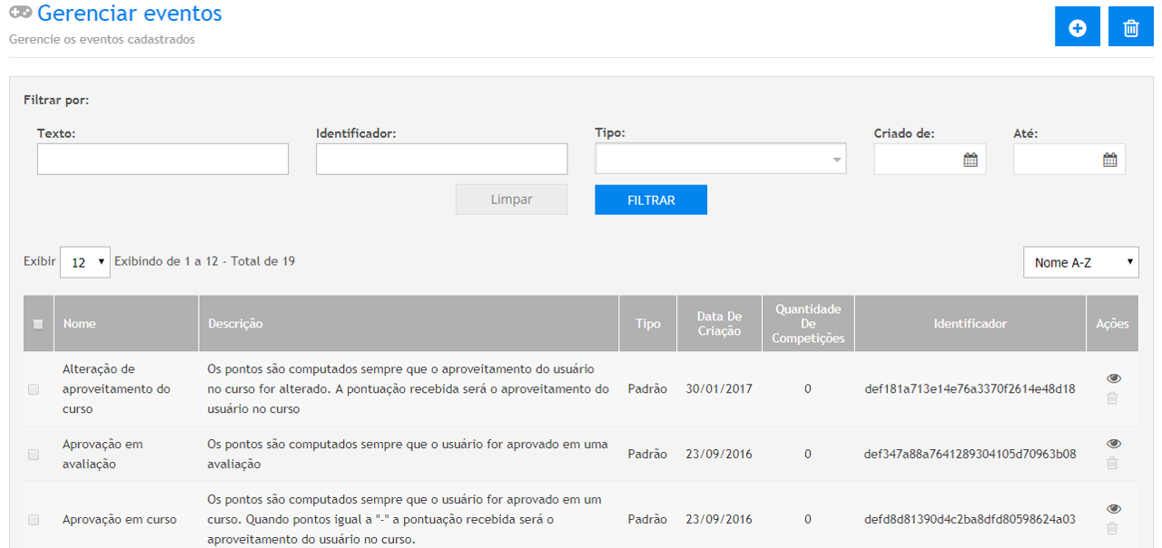 Na tela acima, podemos observar a existência de vários eventos que são apresentados pelo nome, descrição, tipo (padrão para eventos nativos da solução e personalizados para eventos criados), data de criação, quantidade de competições que possuem o evento e identificador.