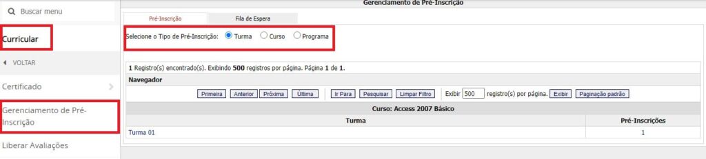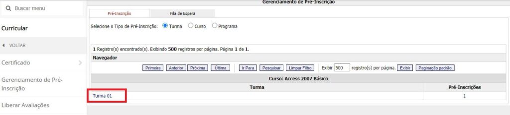 Após filtrar, o sistema exibe a(s) turma(s) em uma lista. Clique no nome da turma que possui pré-inscrições cadastradas.