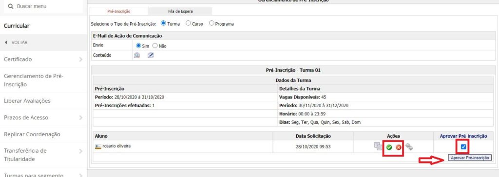 Selecione a opção de aprovação ou negação na coluna aprovar pré-inscrição, em seguida, clique no botão aprovar pré-inscrição.