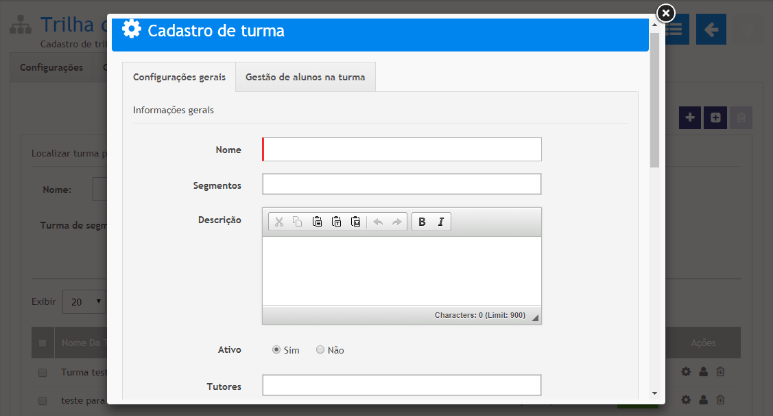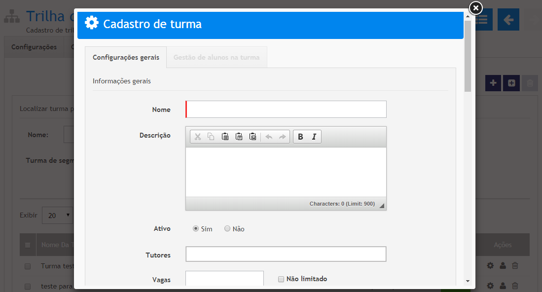 Clicando no botão “Adicionar Turma”, conforme destacado na imagem acima, será habilitado o formulário abaixo: