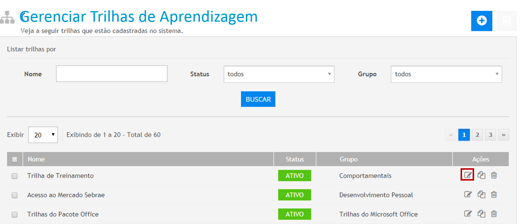 Através do menu Conteúdo » Trilhas de Aprendizagem 2.0 » Gerenciar, você poderá criar turmas para trilhas de aprendizagem. Cada turma poderá ter as suas próprias configurações, ser fechada ou livre, com ou sem pré inscrição, conforme necessário. Localize a trilha que deseja e, é acesse o botão “Editar” localizado na coluna ações como mostra a imagem abaixo: