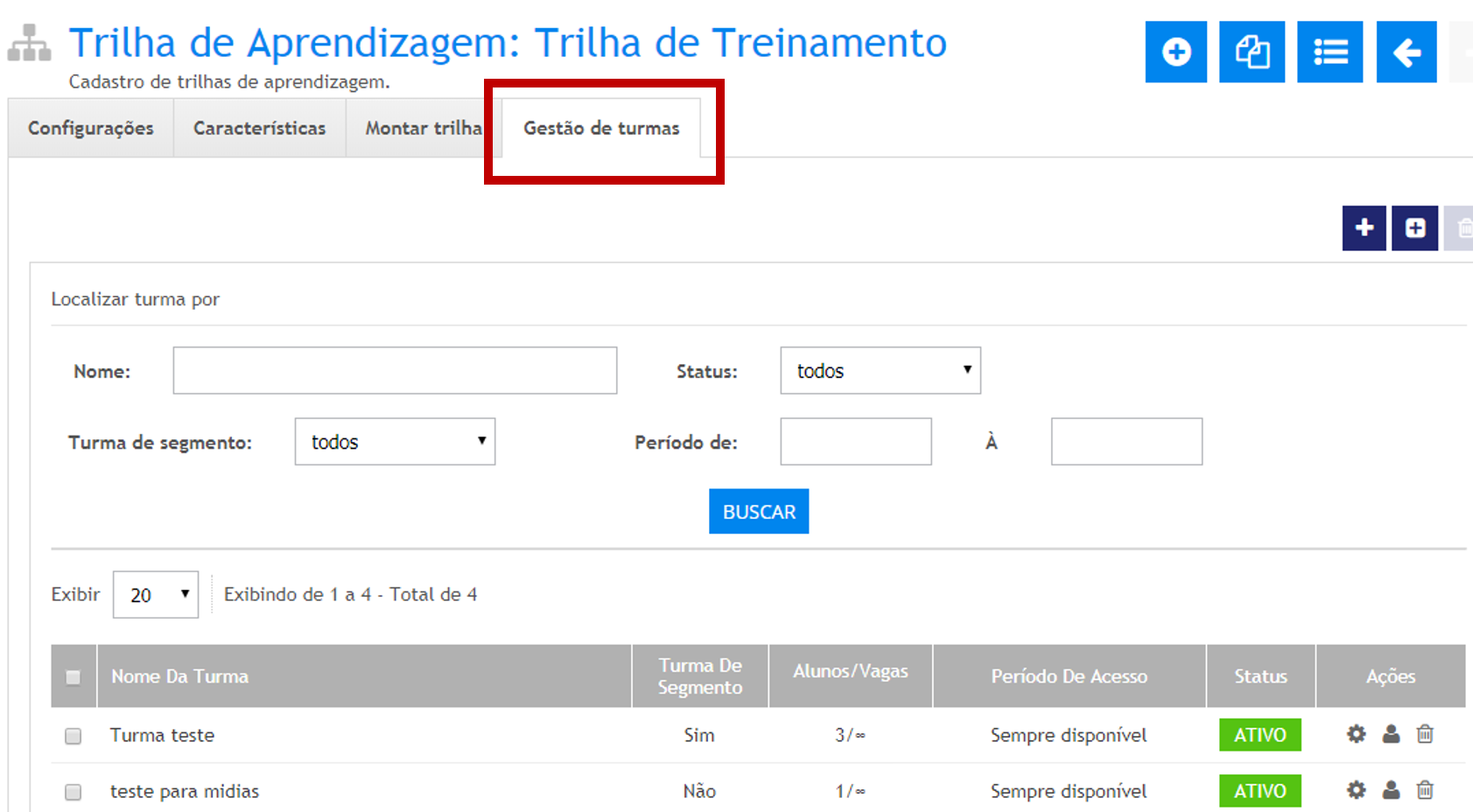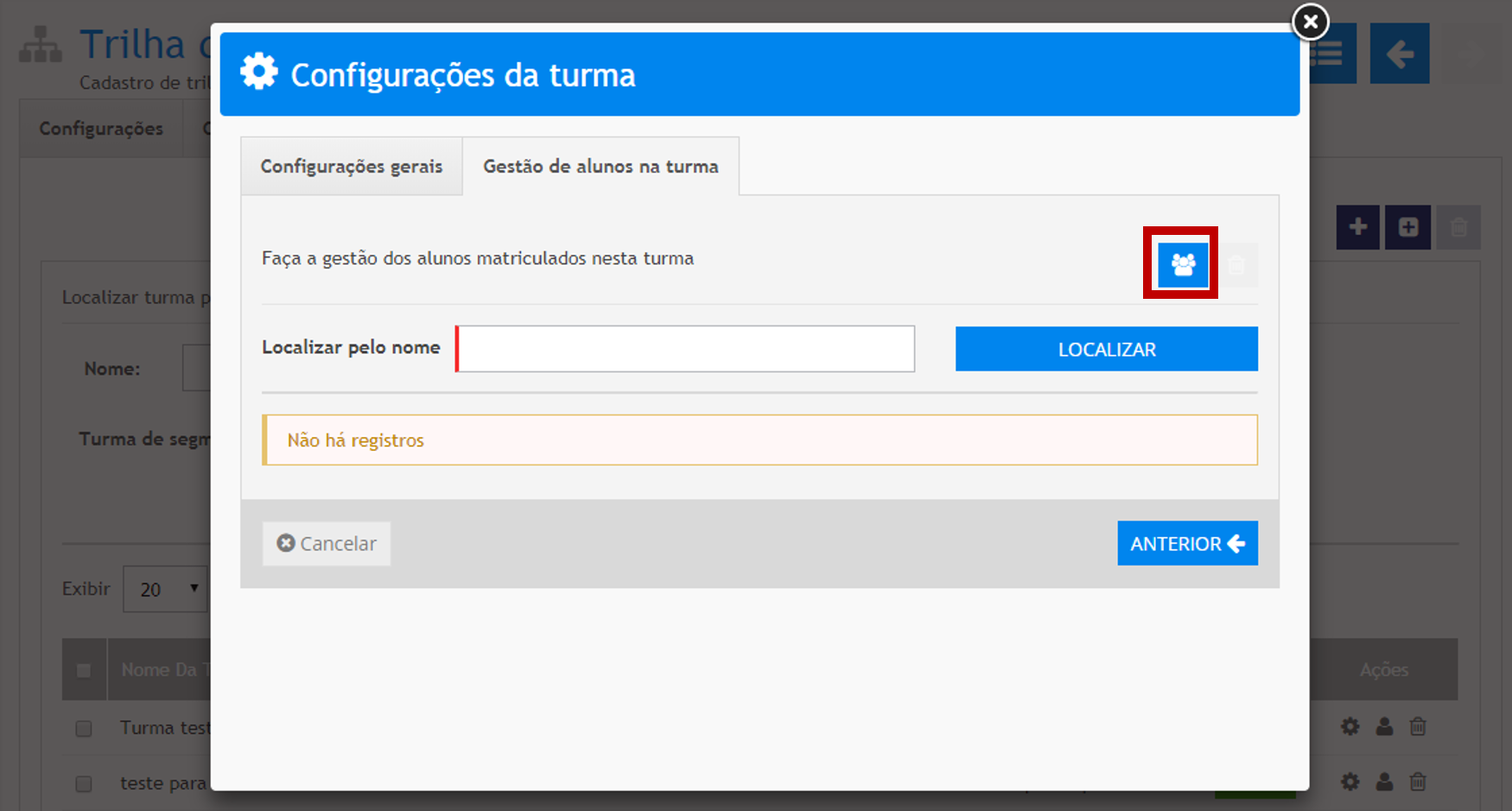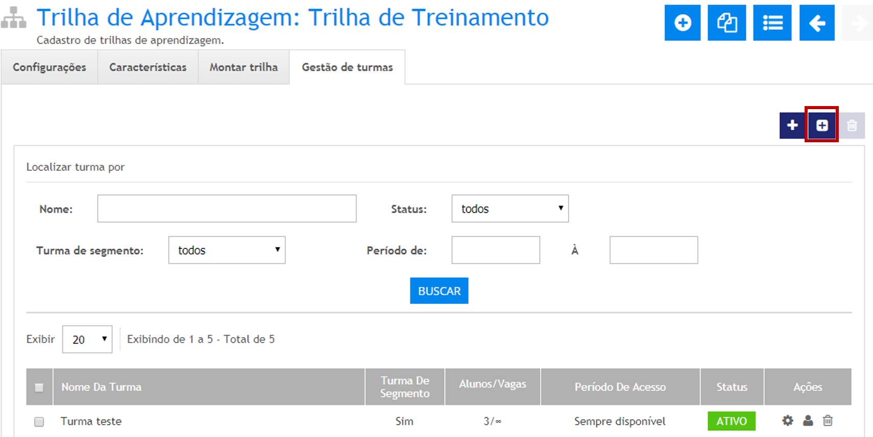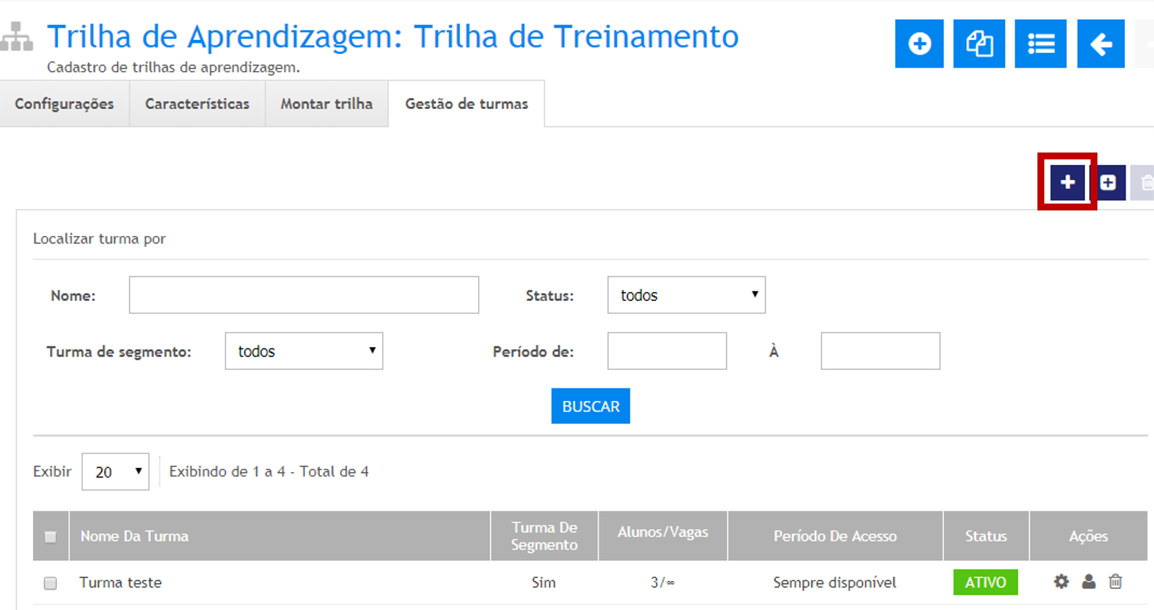 Para criar uma turma de Trilha de Aprendizagem segmentada clique no Ícone conforme destacado na imagem abaixo: