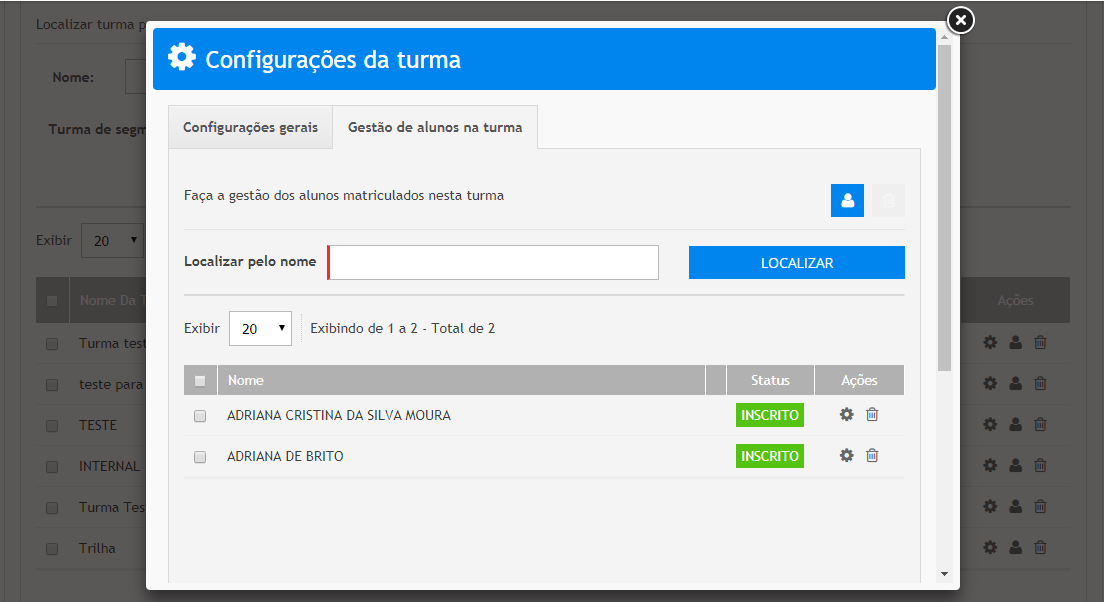 Acessando o botão acima, o sistema irá listar todos os alunos da turma, permitindo assim que você realize a ação de exclusão clicando no ícone “Excluir” na coluna ações.