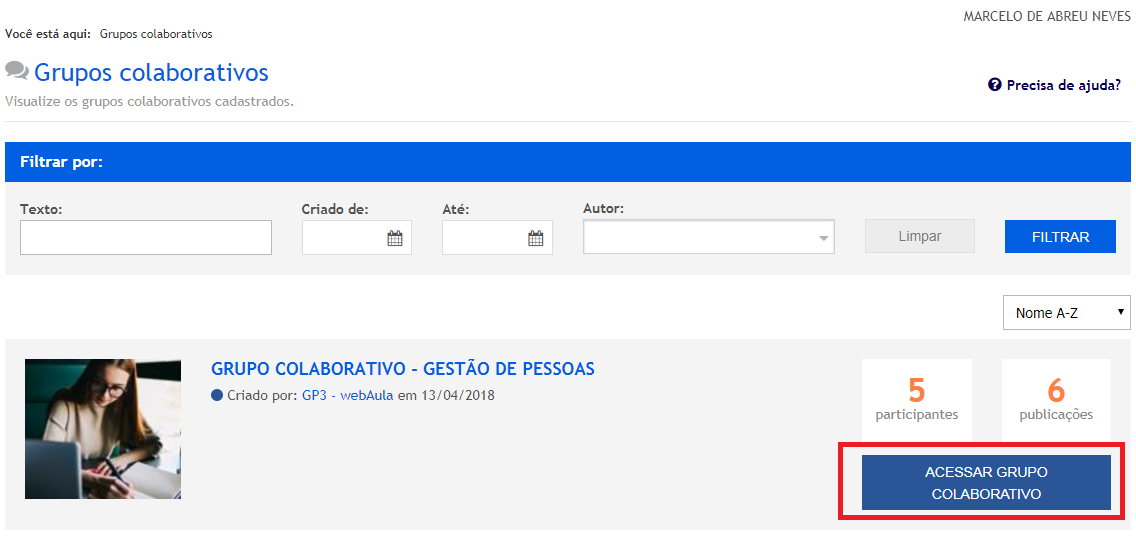 O recurso “Grupos Colaborativos” é um espaço de colaboração criados através do ambiente administrativo do LMS webAula. Nestes grupos, os alunos tem a possibilidade de compartilhar conteúdos relevantes em diversos formatos de mídias desde de que estejam de acordo com o propósito do Grupo. É um recurso poderoso garantir ainda mais interação entre seu público, assim como engajamento e compartilhamento de conhecimento.