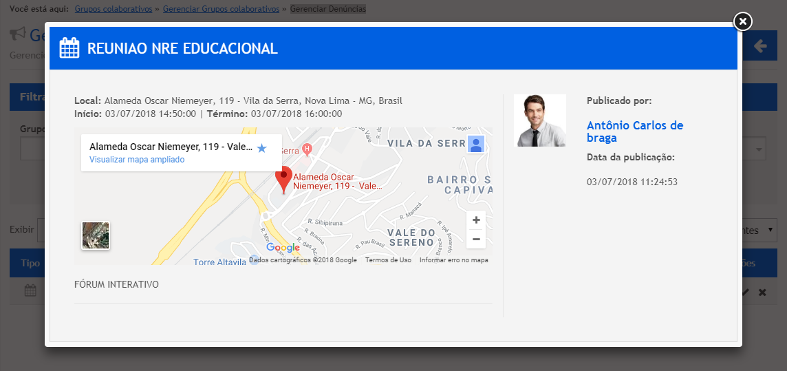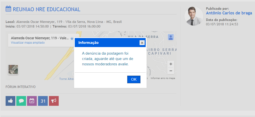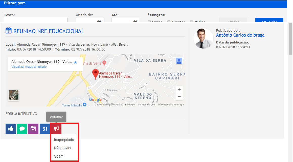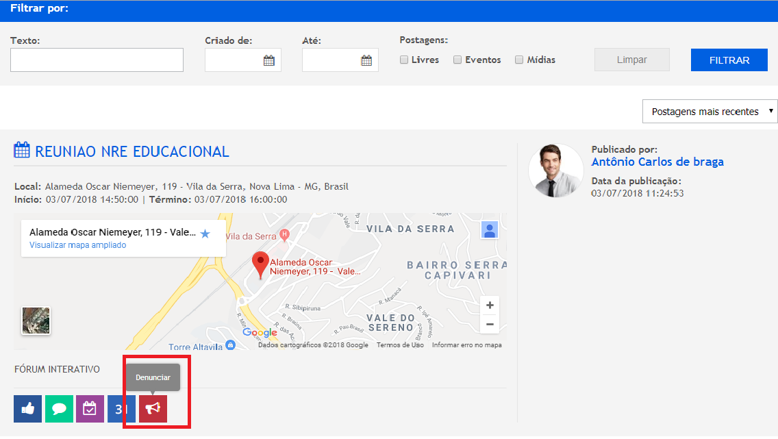 Acessando o Grupo o participante terá acesso a todas as postagens realizadas. Em cada postagem, logo ao final será exibido uma barra de menus para que ele possa curtir, salvar a data em caso de evento e por último “Denunciar” uma postagem que julgue estar fora do objetivo do grupo. Observe na imagem destacada abaixo, o botão “Denúncia”:
