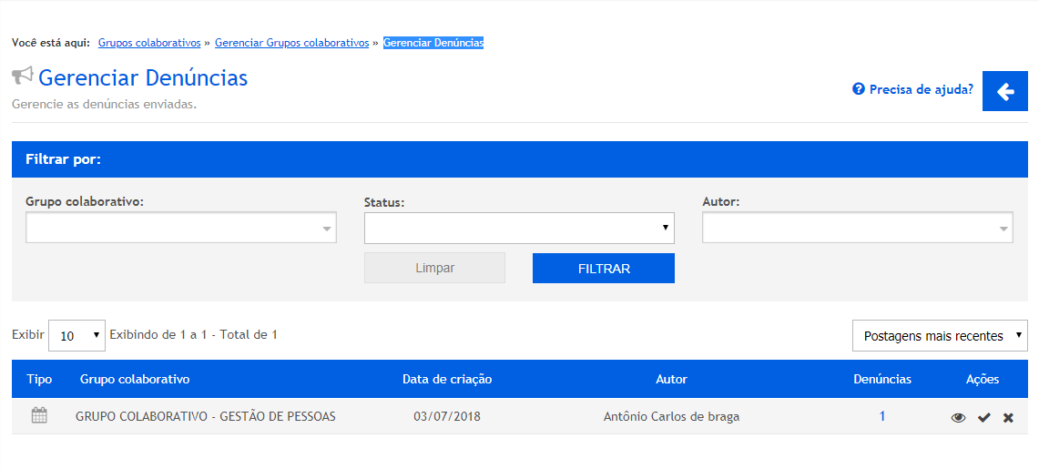 Voltando a tela de gerenciamento de denúncias. Na coluna “Ações” poderemos realizar algumas ações referente a denúncia e decidir se ela procede ou não.