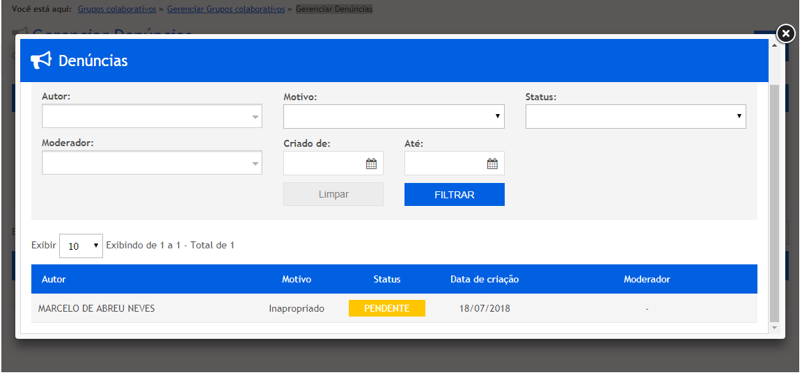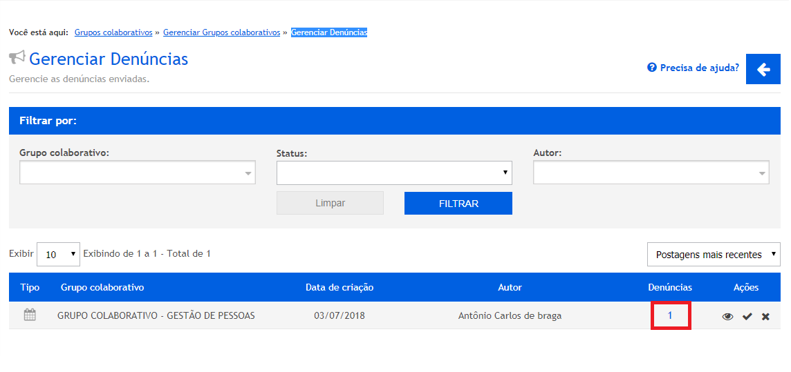 Na coluna “Denúncias” poderemos visualizar a denúncia e e quem a realizou. Para isso, clique no número de denúncias, conforme destacado abaixo: